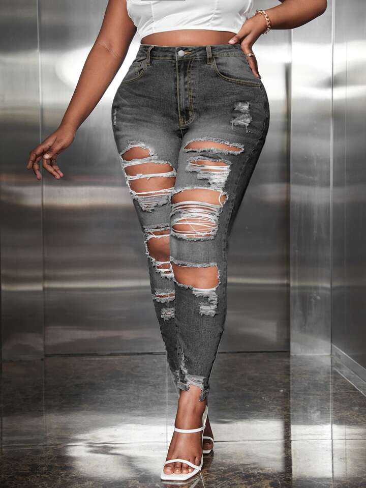 جينز نحيل ممزق خصر عالي بدون حزام مقاس كبير
