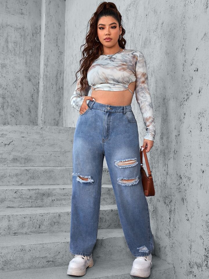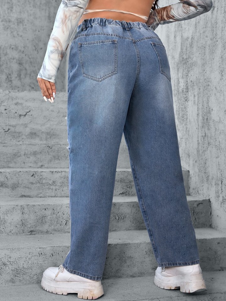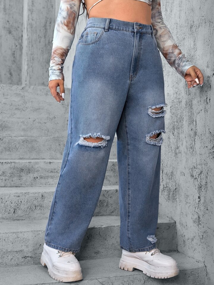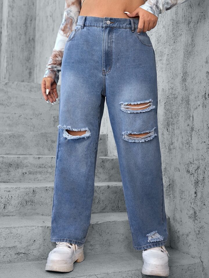 جينز بساق مستقيم خصر عالي ممزق مقاس كبير