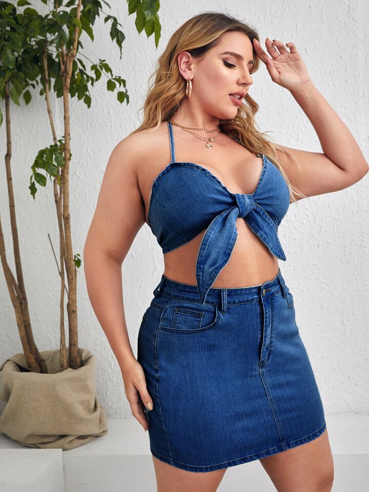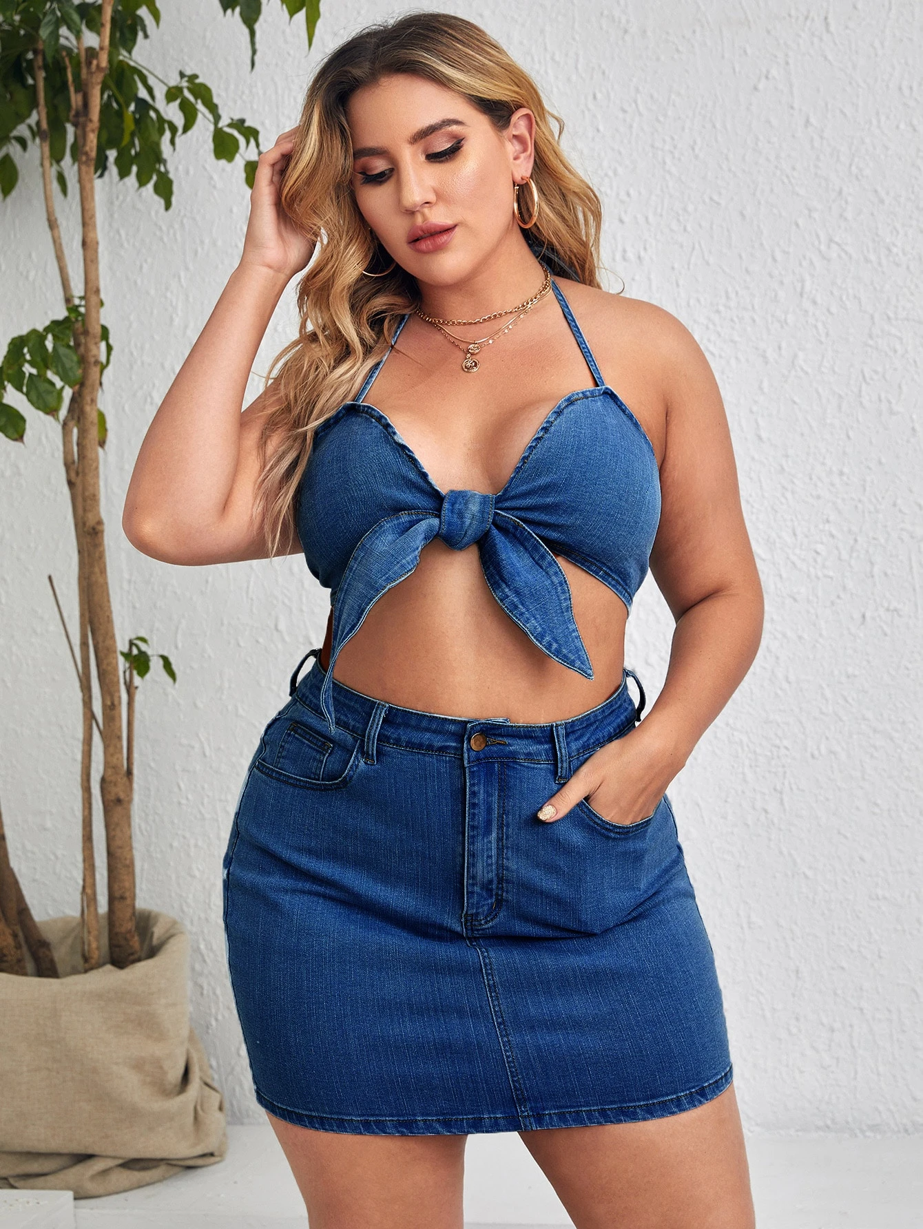 طقم تنورة مع لباس علوي جينز بربطة خلفية معقود مقاس كبير