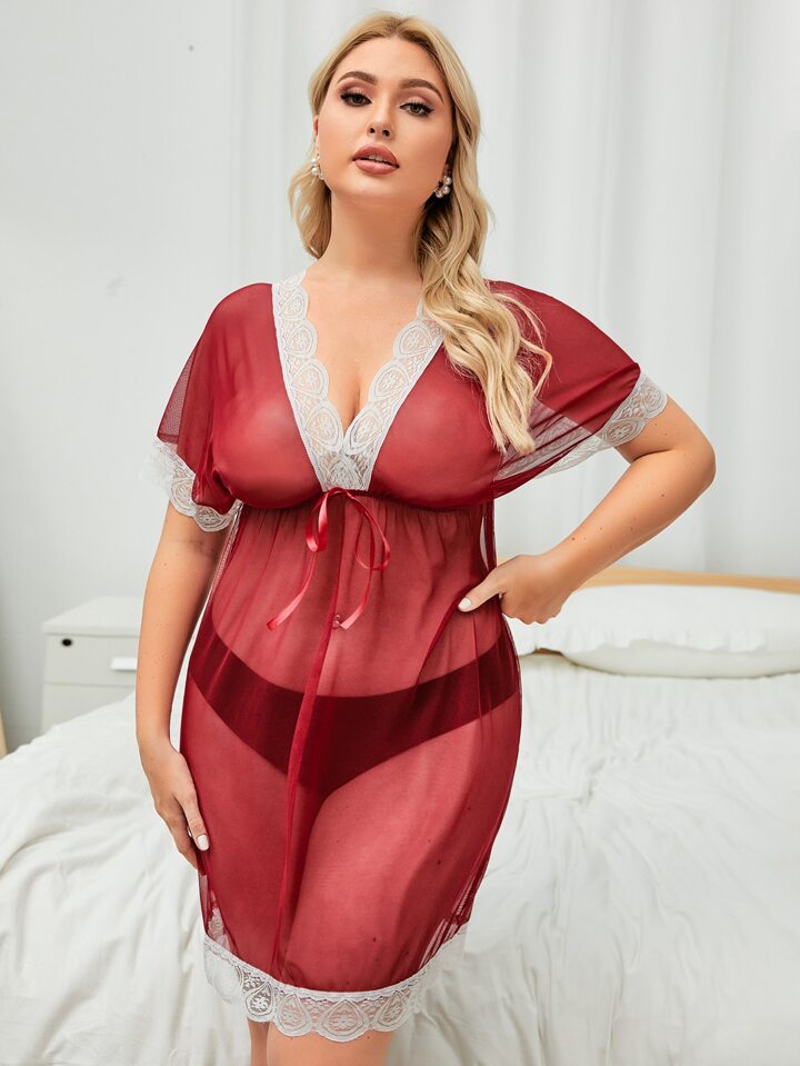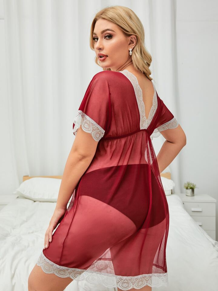 فستان شبكي شفاف مقلم بدانتيل مقاس كبير مع سروال داخلي رفيع