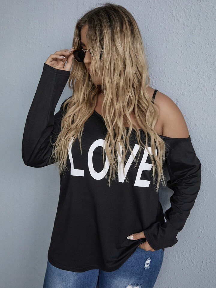 مقاس كبير تي شيرت طباعة أحرف ياقة غير متماثل