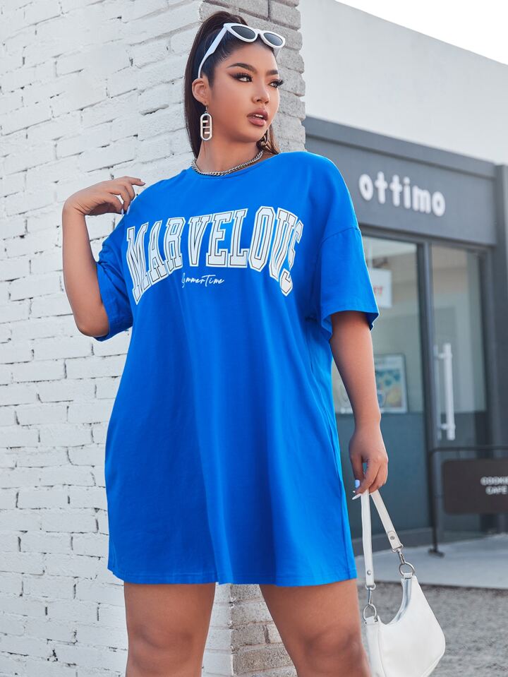 مقاس كبير فستان بطباعة أحرف منخفض الاكتاف