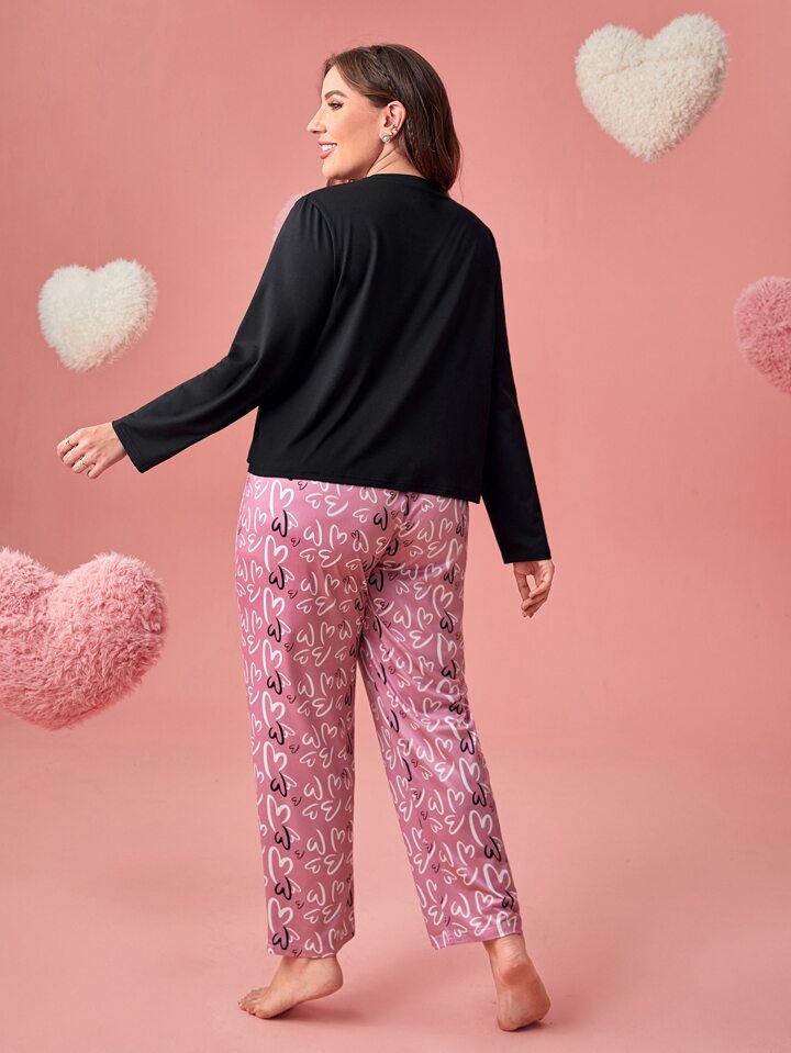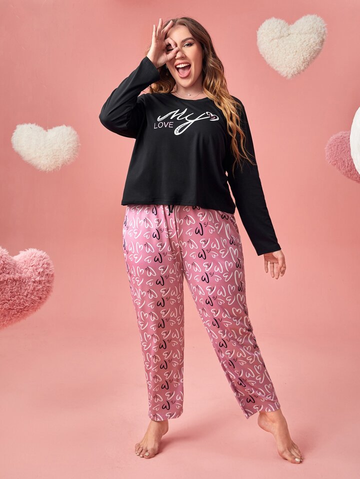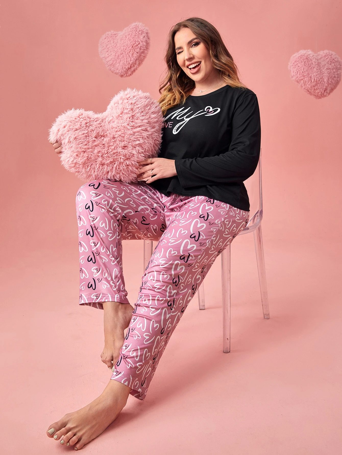 مقاس كبير بطباعة أحرف تي شيرت و بطباعة قلب بنطلون طقم بيجامة