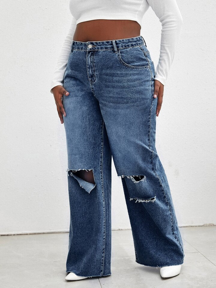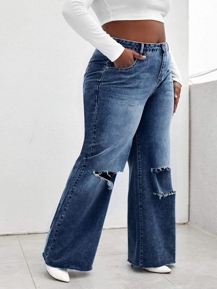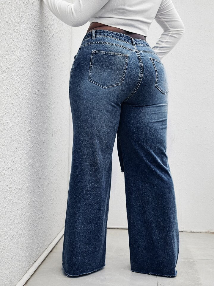 بنطلون جينز بساق واسع بحاف خام بتفاصيل ممزق مغسل خفيف مقاس كبير
