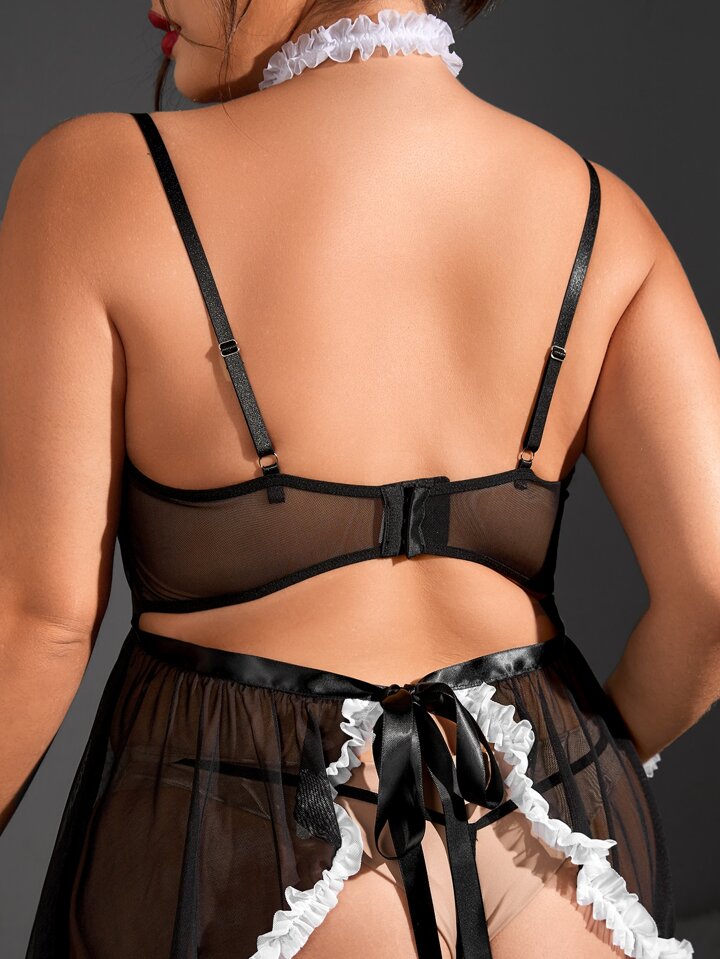 مقاس كبير شبكة مقلم دانتيل تنورة زي خادمة مع ثونغ و مريلة