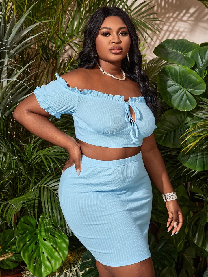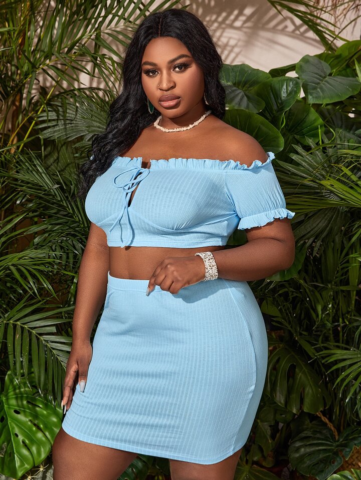 مقاس كبير مكشوف الكتف ربطة امامية لباس علوي قصير مع طقم تنورة
