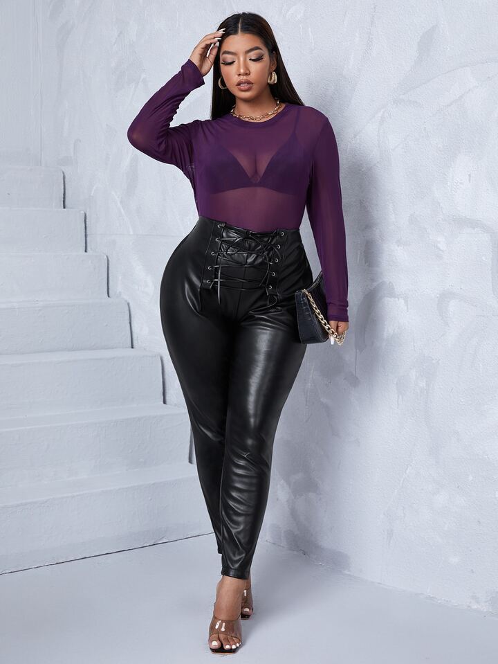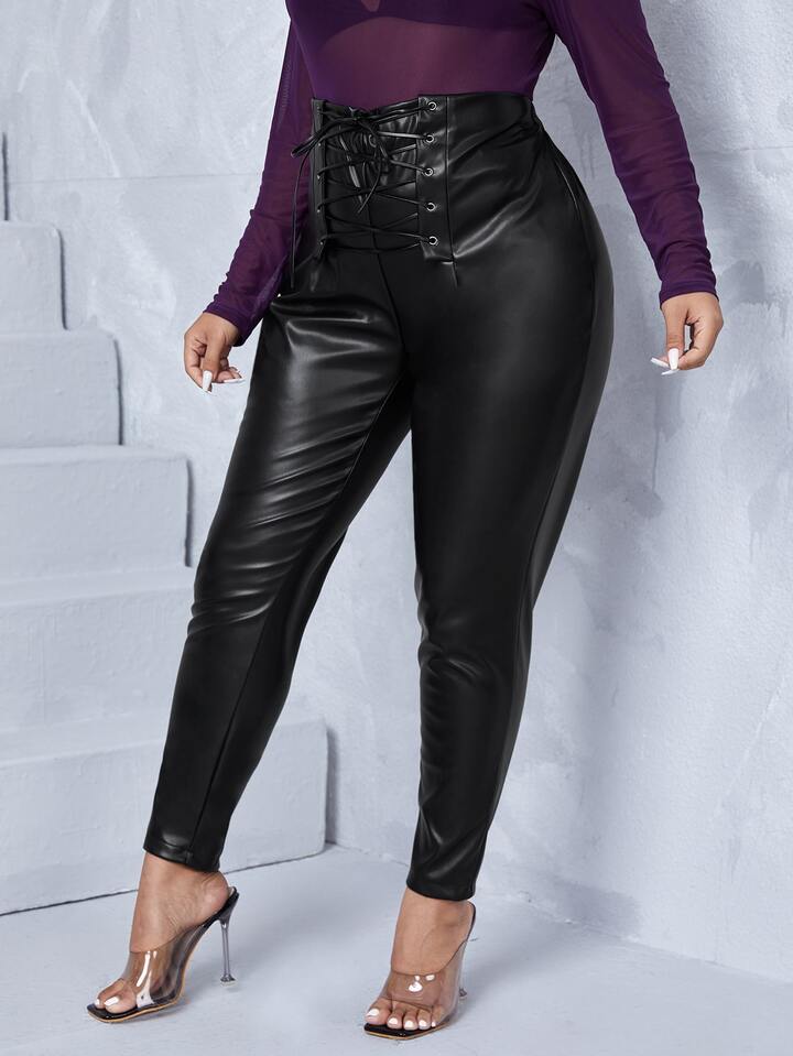 بنطلون نحيل بخصر برباط جلد صناعي مقاس كبير