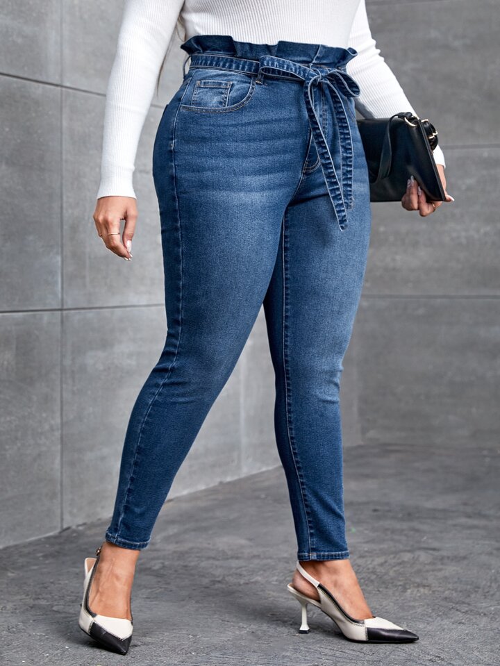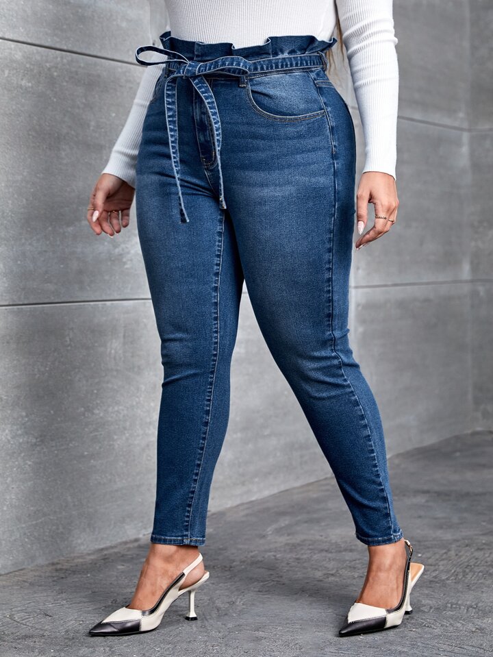 بنطلون جينز نحيل خصر مكشكش ورقي حزام مقاس كبير