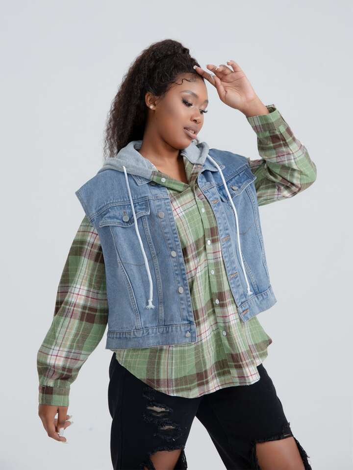 مقاس كبير مربعات ملونة أزرار أمامية بلوزة مع رباط جاكيت دنيم طقم