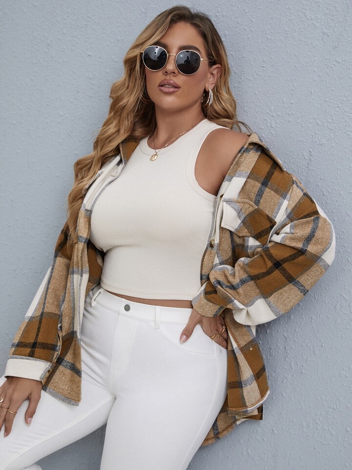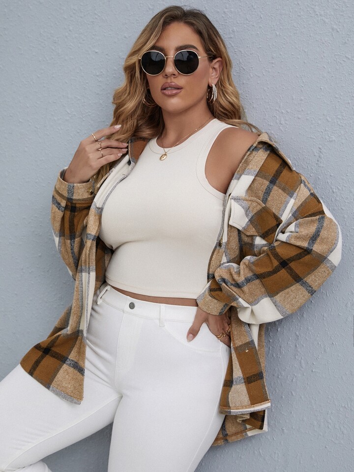 معطف منخفض الكتف بجيب رفرف مربع النقش مقاس كبير