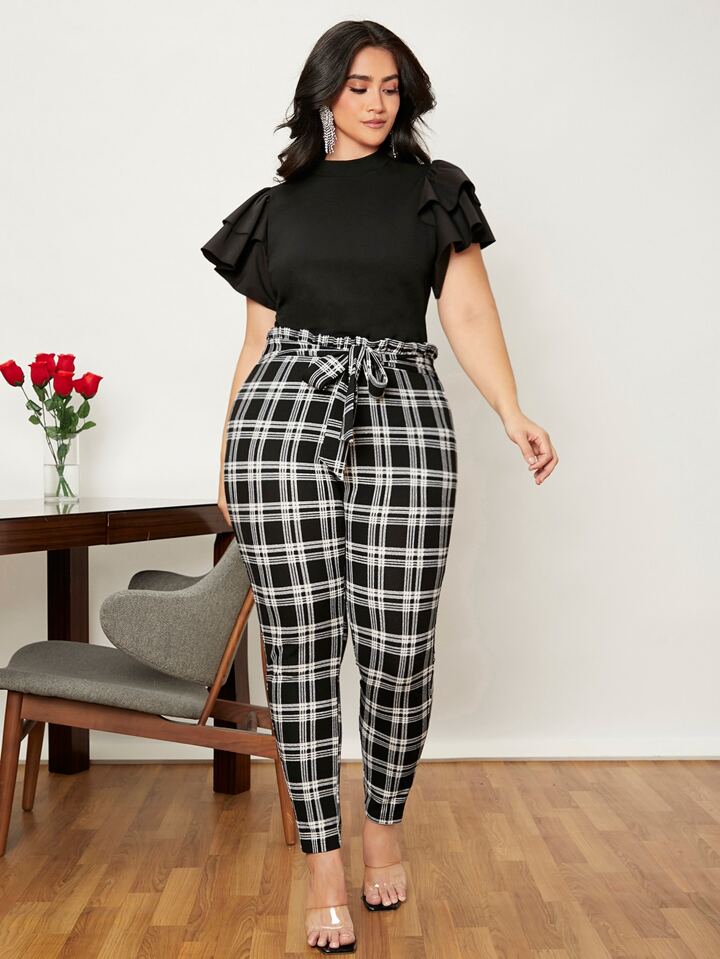 مقاس كبير بنطلون نحيل طباعة مربع النقش خصر مكشكش ورقي معقود من الأمام