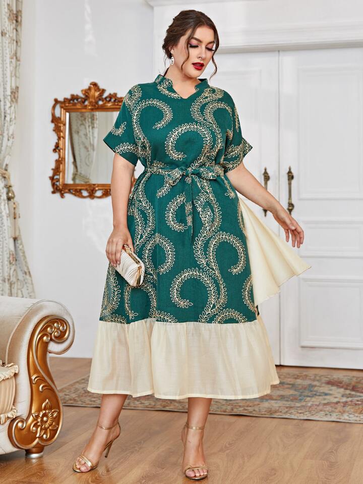 فستان بحزام بحافة مكشكش بطباعة نباتات مقاس كبير