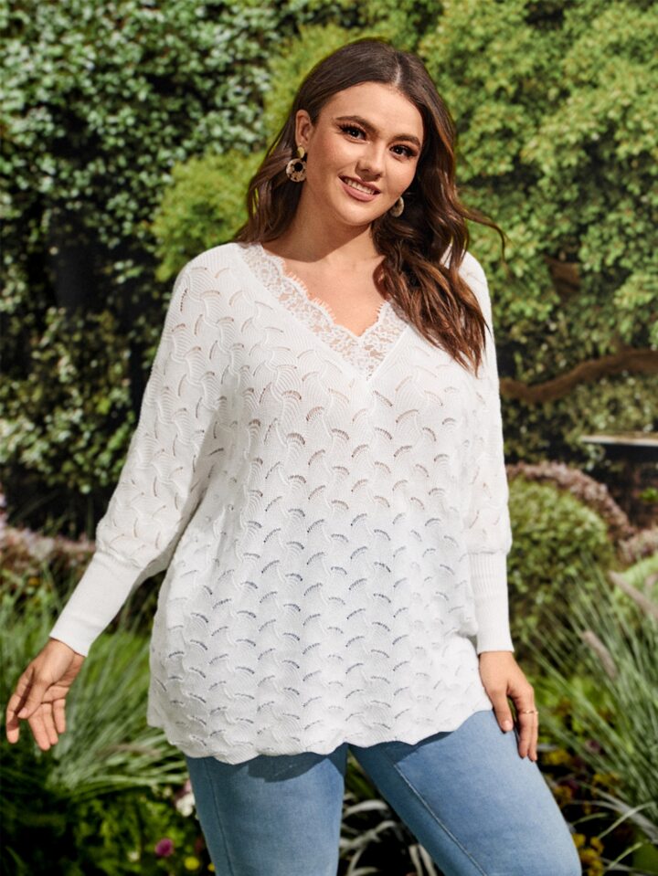 مقاس كبير كنزة صوف منسوج بفتحات صغيرة بلوحة دانتيل رمش اكمام جناح الخفاش
