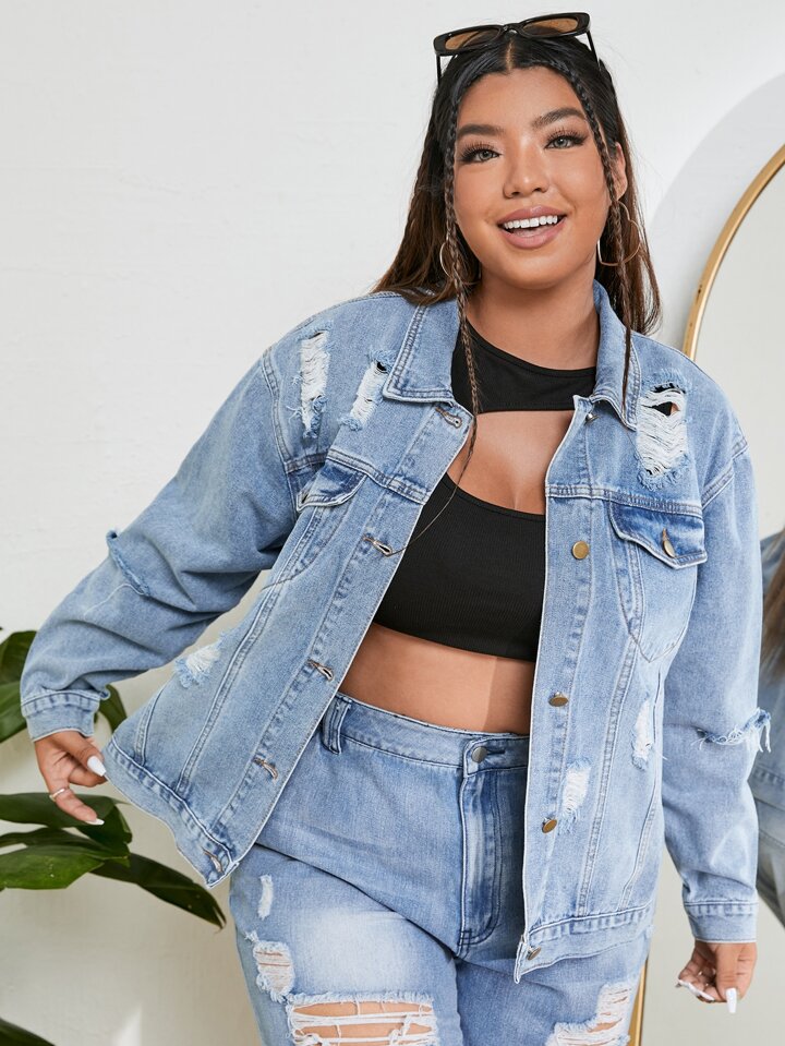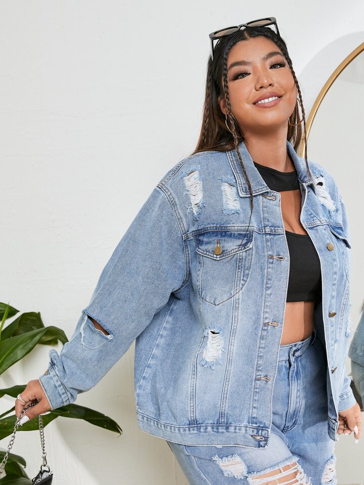 جاكيت دنيم ممزق مهتري الحواف جيب قلاب منخفض الاكتاف مقاس كبير
