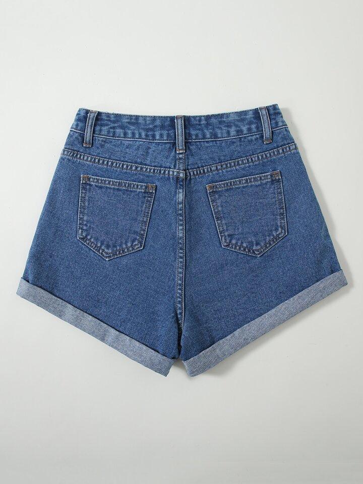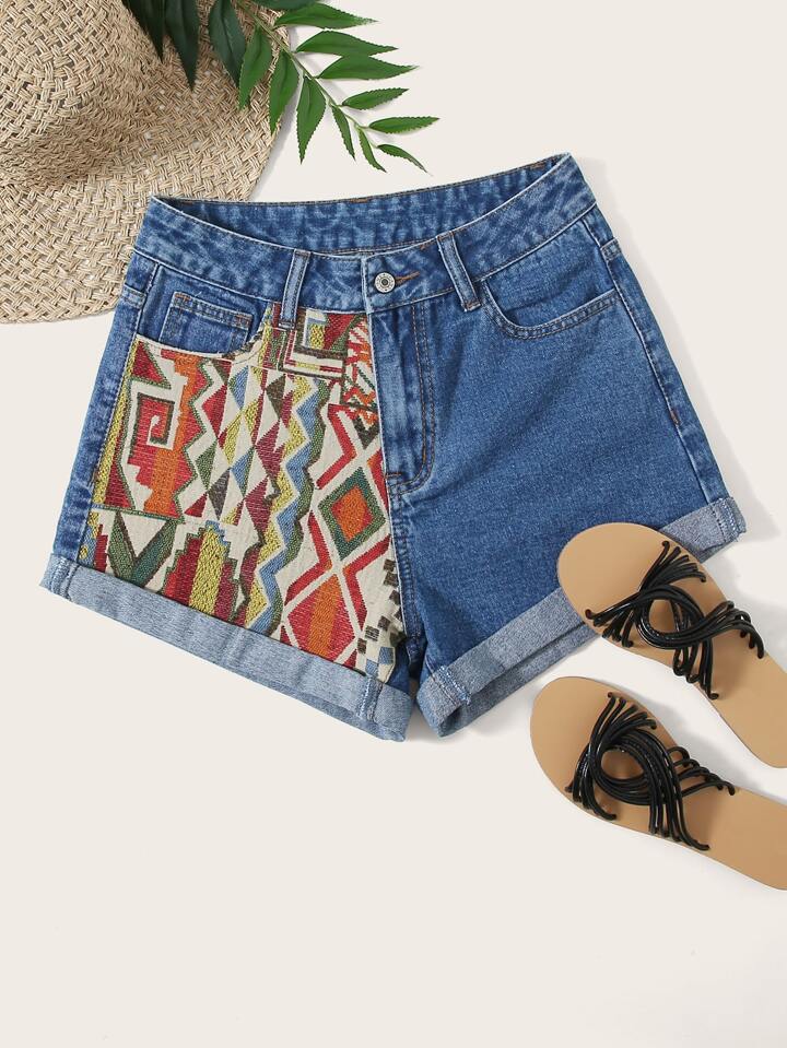 شورت دينيم مطرز هندسي بحافة ملفوف مقاس كبير