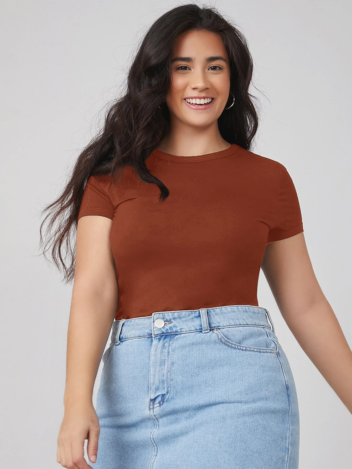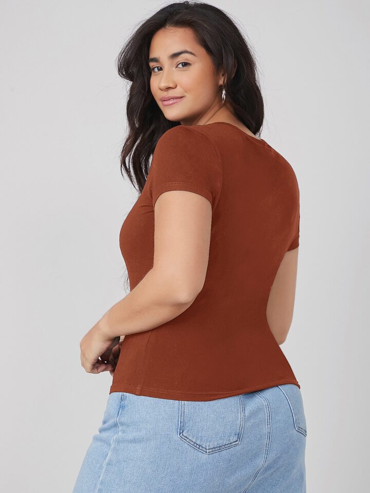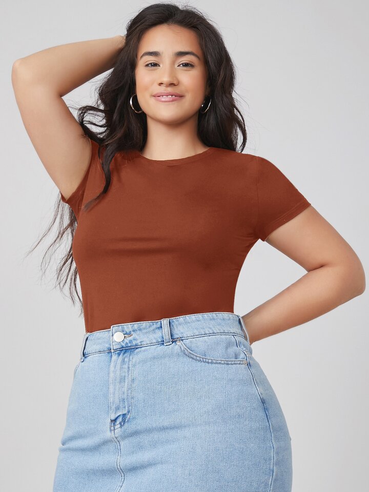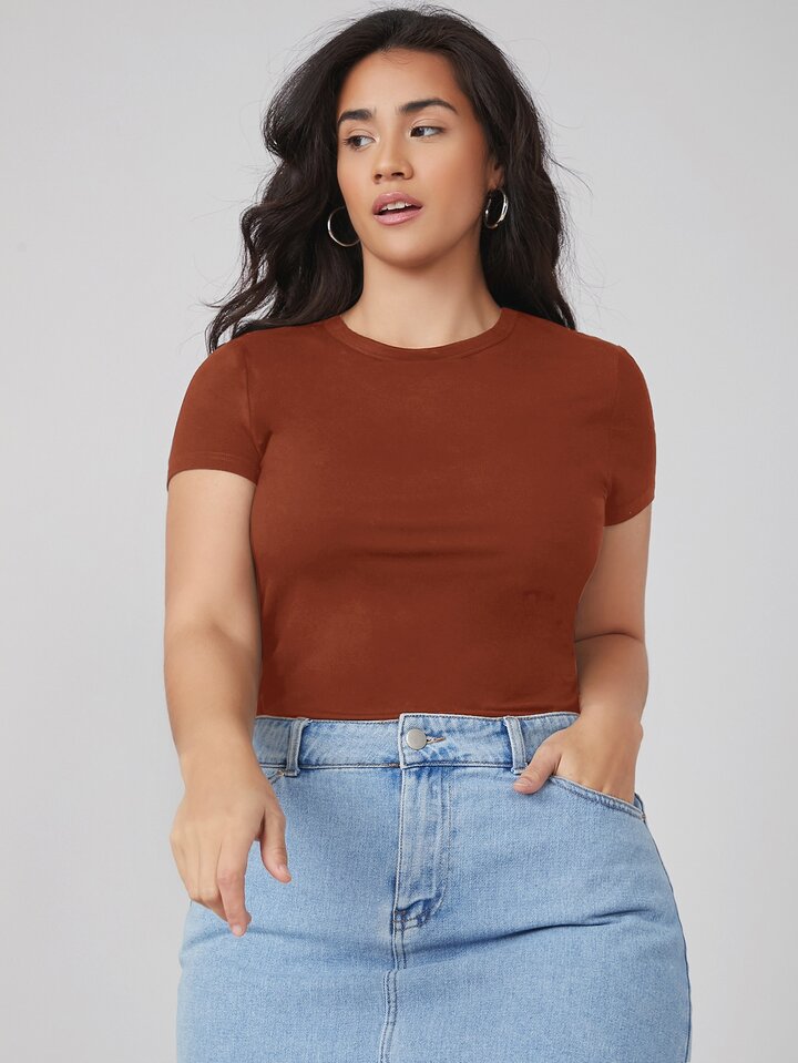 تي شيرت نحيل مقاس كبير بلون موحد وبياقة دائري