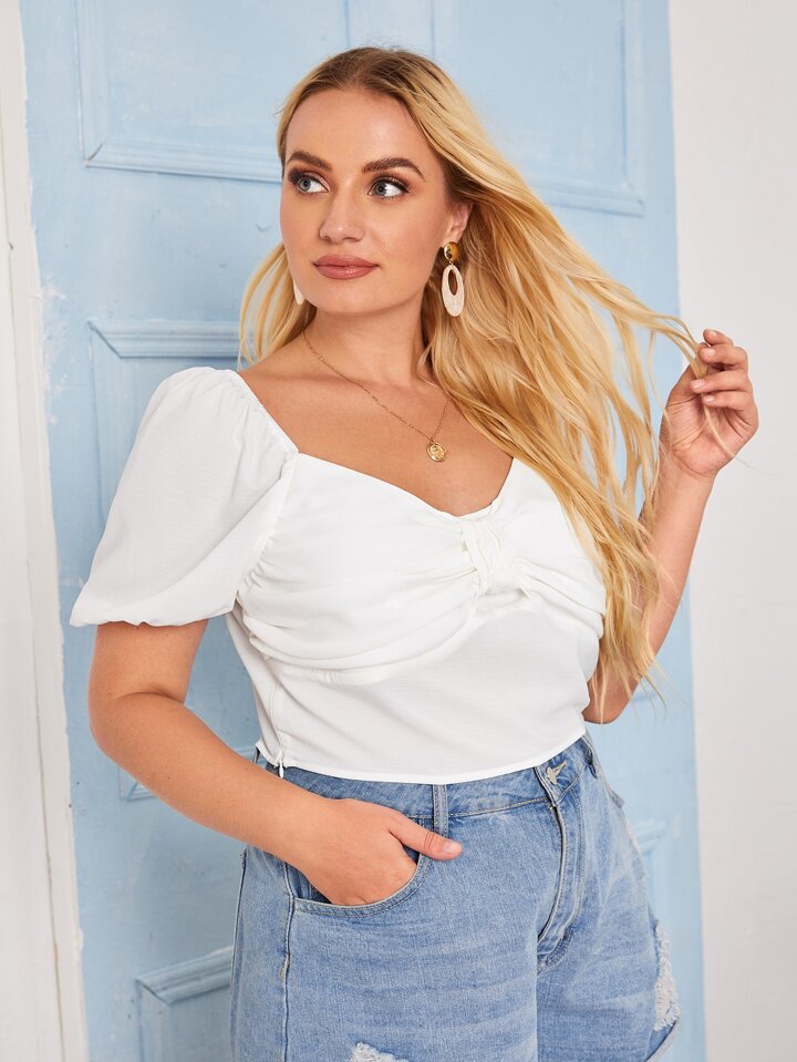 بلوزة باكمام منتفخة وبصدر مكشكش مقاس كبير