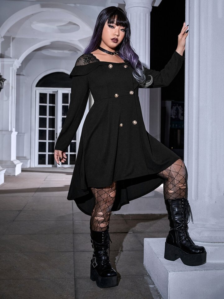 فستان مقلم بكشكش صف ازرار مزدوجة حافة منخفضة وعالي مقاس كبير