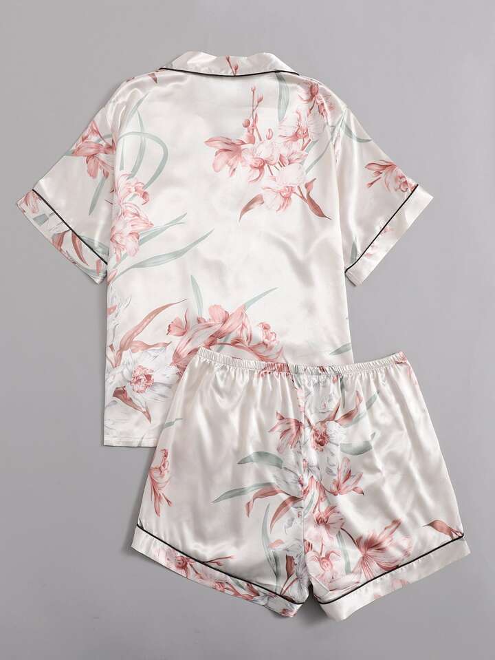 طقم بيجامة مقاس كبير بياقة مسنن بطباعة زهر ساتان
