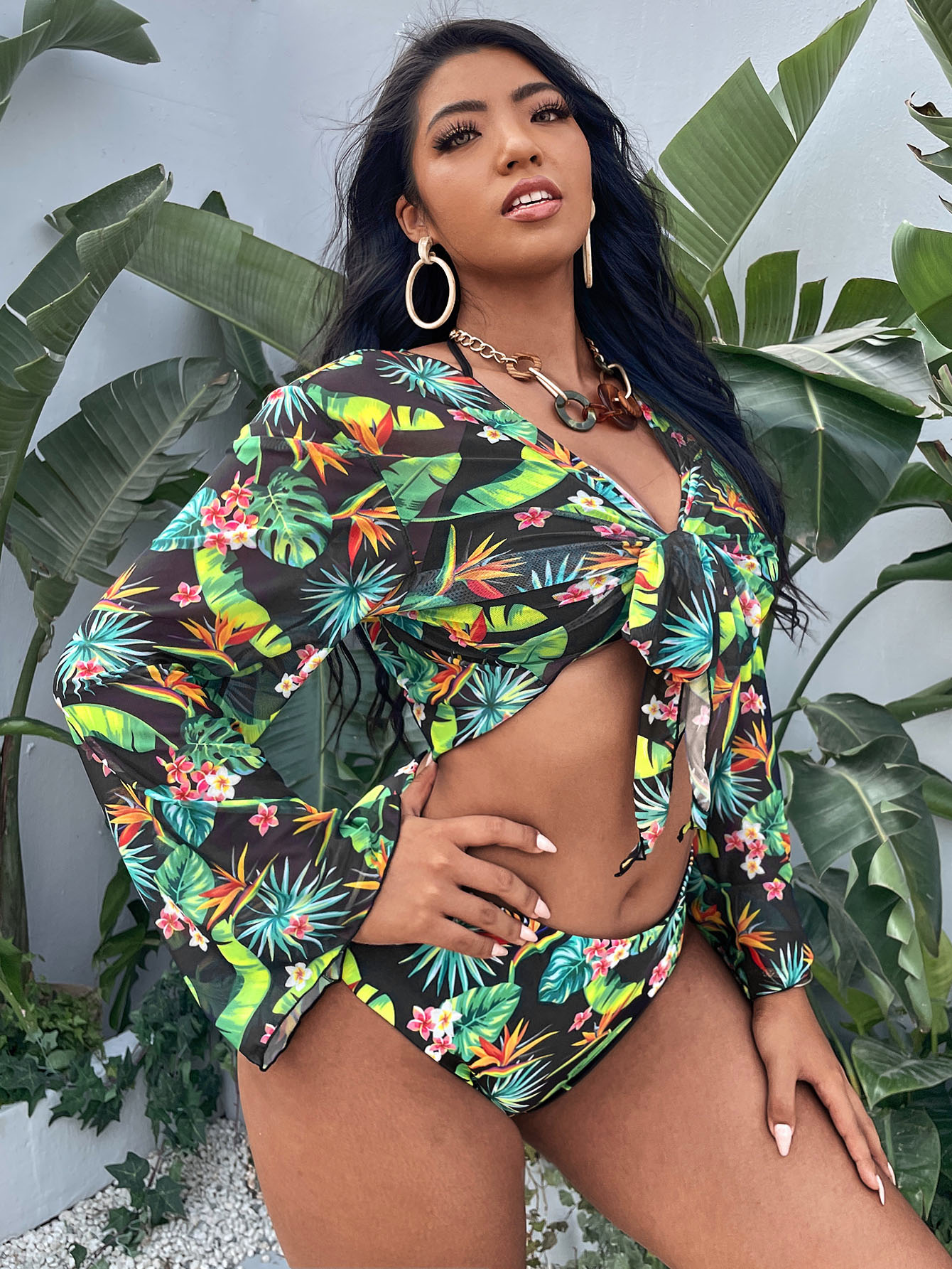 طقم بكيني هولتر ذو طبعة استوائية وكيمونو للشاطئ تحت المقاس الكبير 3 قطع