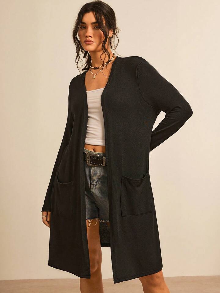 معطف مقاس كبير بلون موحد وبجيب مرقع مفتوح من الامام
