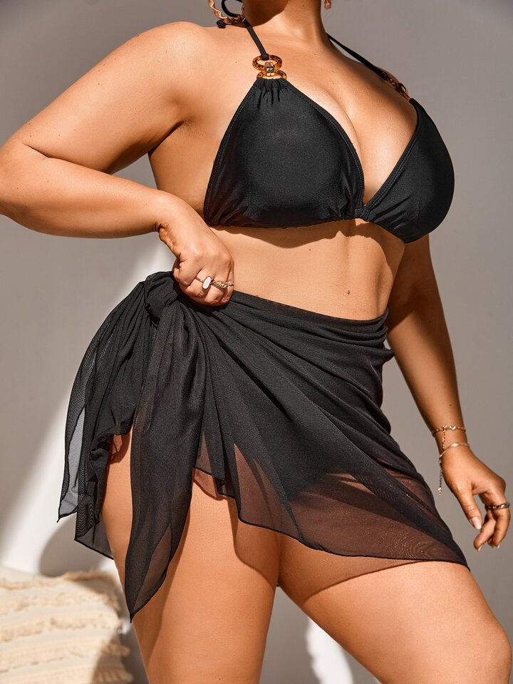 مجموعة بيكيني بحجم كبير بصدرية مرتبطة بحلقات وسراويل عالية الخصر وتنورة غطاء 3 قطع بيكيني صيفي شاطئي