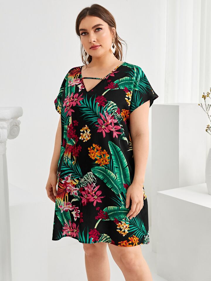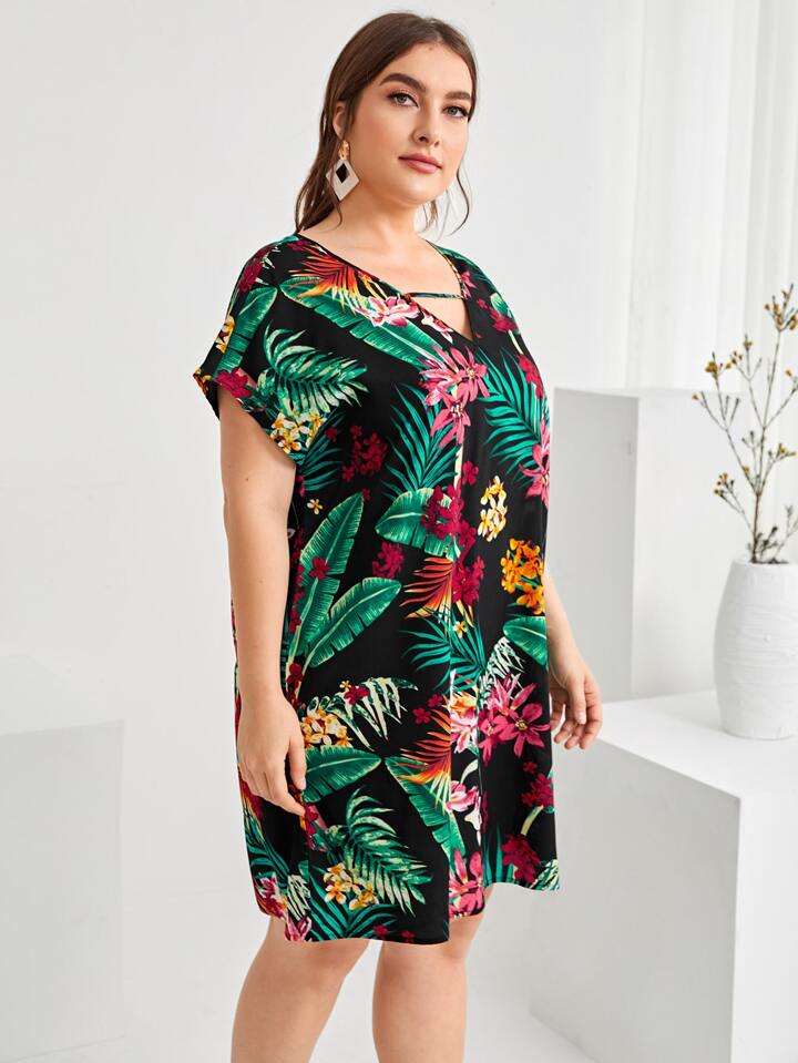 فستان تونيك مطبوع بطبعات زهور وأشكال استوائية مخرم للصيف للمقاسات الكبيرة