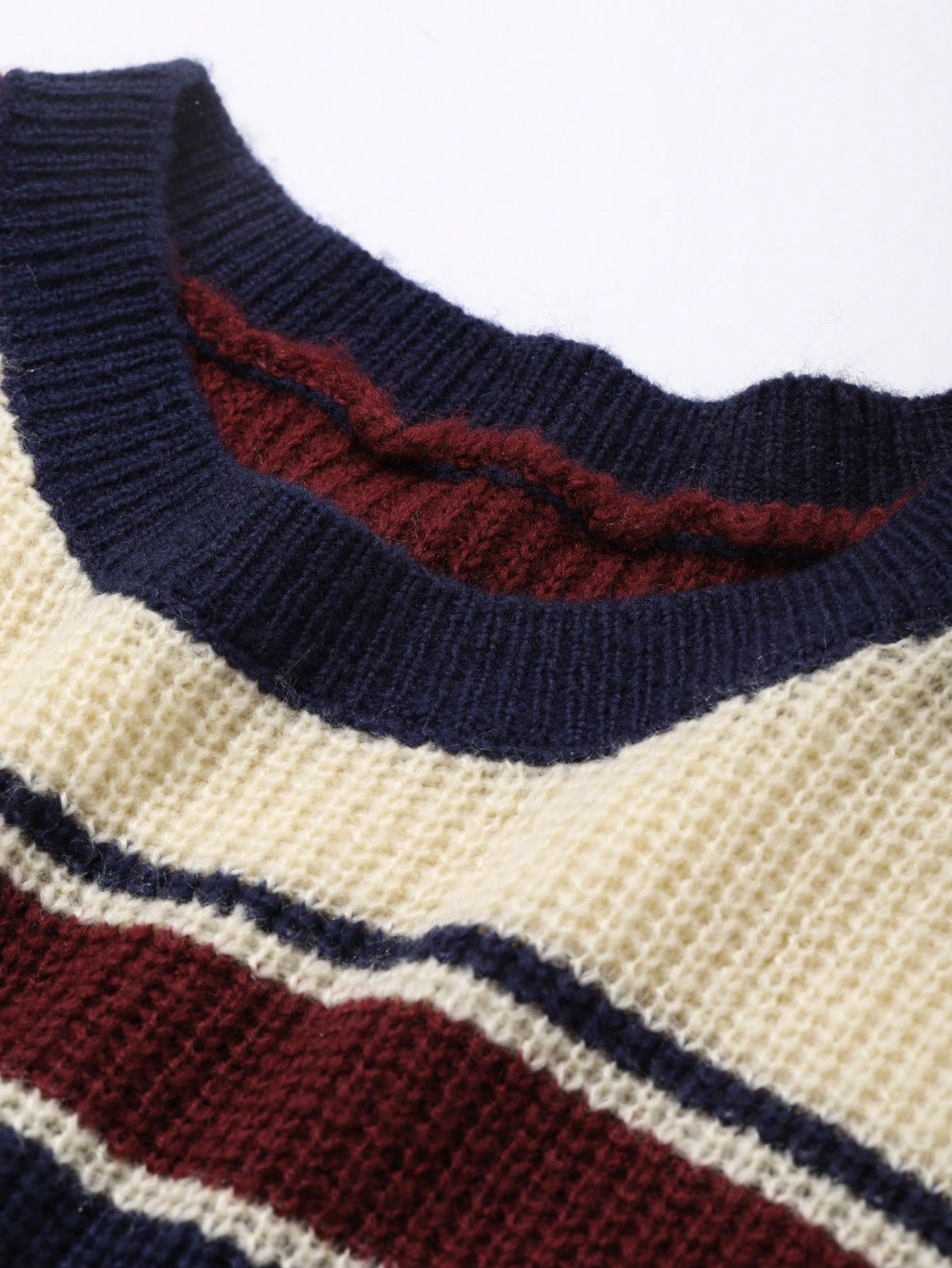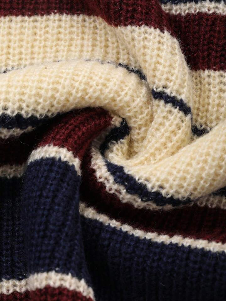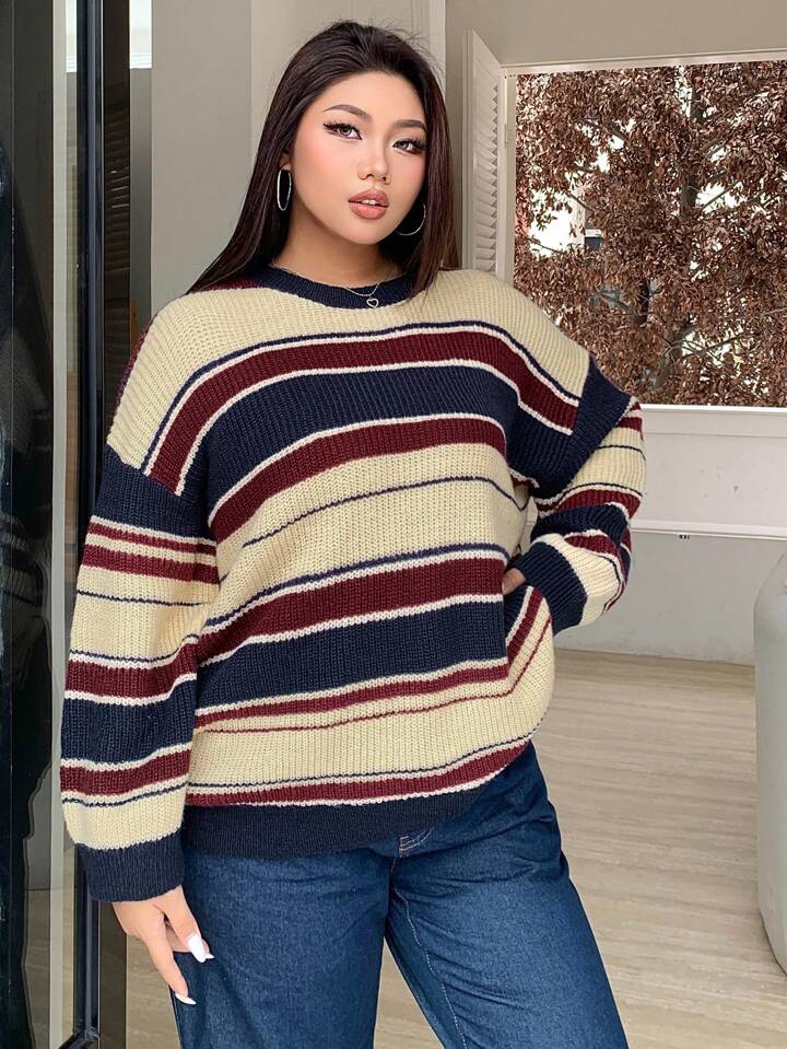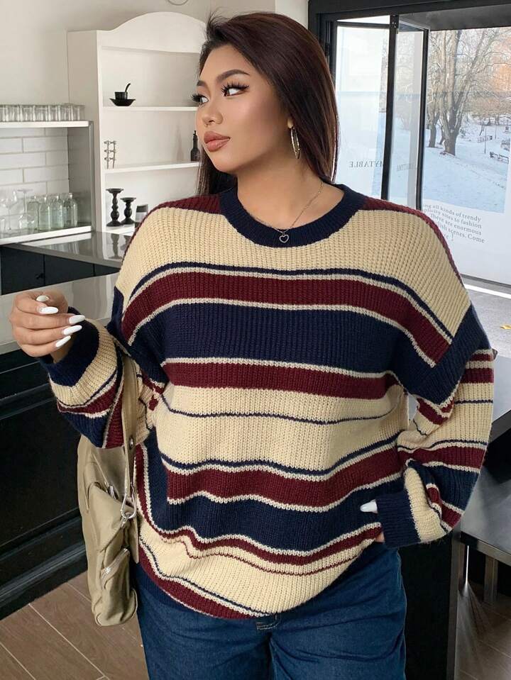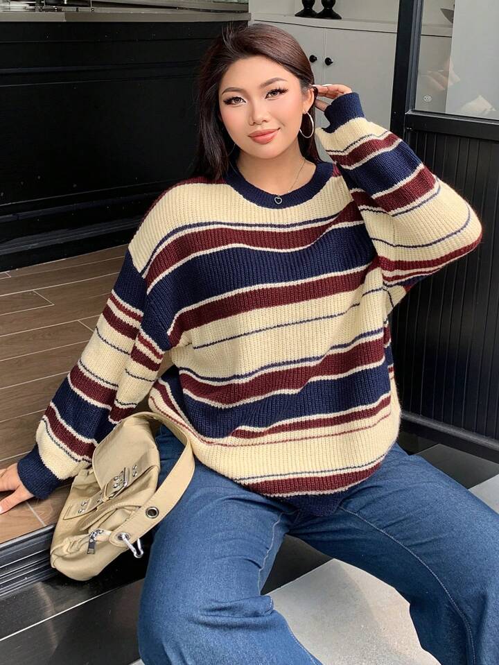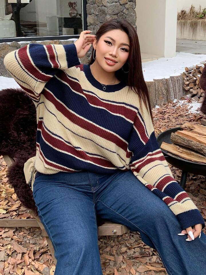 كنزة صوفية كاجوال بأنماط ملونة وخطوط فضفاضة بياقة مستديرة للمقاسات الكبيرة ، خريف/شتاء