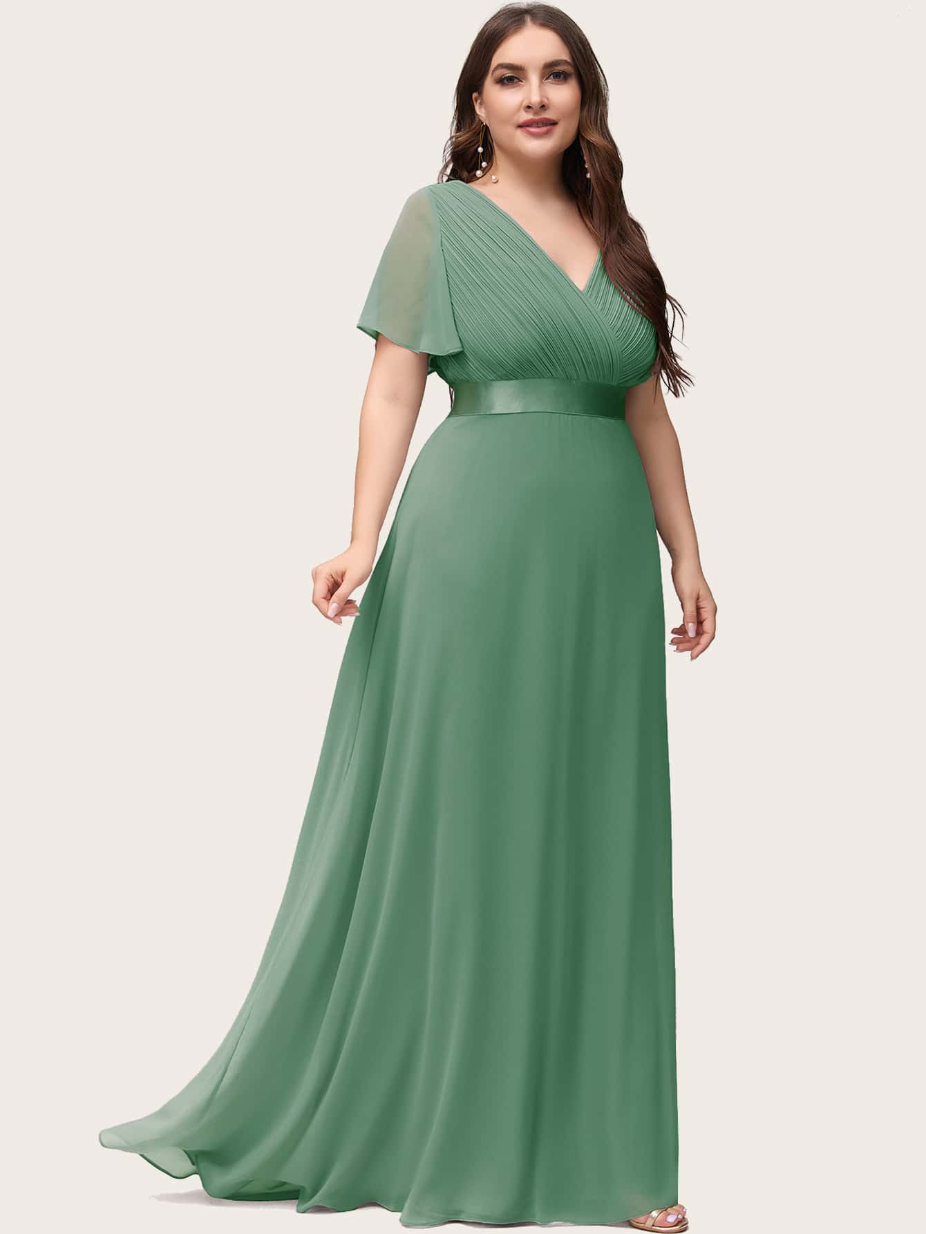 فستان وصيفة العروس أنيق بياقة على شكل حرف V مطوي عند الصدر باللون الأخضر، فساتين ضيوف الزفاف، فساتين رسمية للحفلات لمقاسات كبيرة في فصل الخريف والشتاء