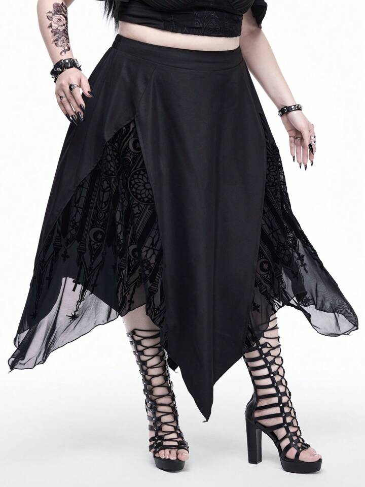 Goth تنورة حريرية مزينة بطراز القصر الجوتي لكبار الحجم مع نمط جاكار وحافة غير متماثلة