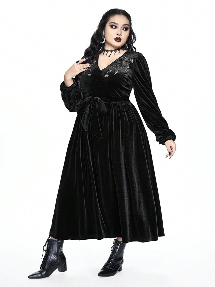 Goth فستان طويل الأكمام مخمل عميق الياقة على شكل أفعى بأنماط مطرزة مثيرة، مقاس كبير، جوتية، لعيد الهالوين