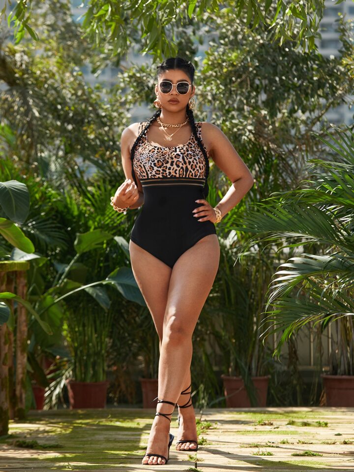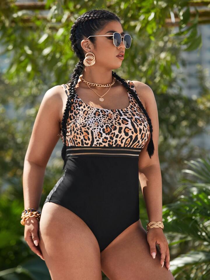 بدلة سباحة قطعة واحدة مقاس كبير، تباين الفهد والشبكة للصيف