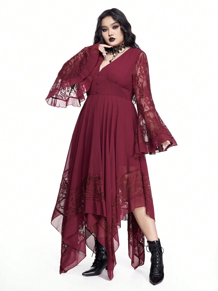 Goth فستان بخصر متباين مع نسيج دانتيل، قُصّة غير متماثلة الأذيال واسعة وياقة عميقة على شكل V للنساء البدينات، مناسب لحفلات رأس السنة