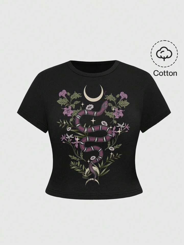 Goth قميص تي شيرت أكمام قصيرة لحجم كبير للنساء بطبعات سوداء سرية لأسلوب موري، بنقوش أفعى ونباتات وأنجم وقمر وفراشات وفراشات، متميز بلون أسود ومريح وجذاب