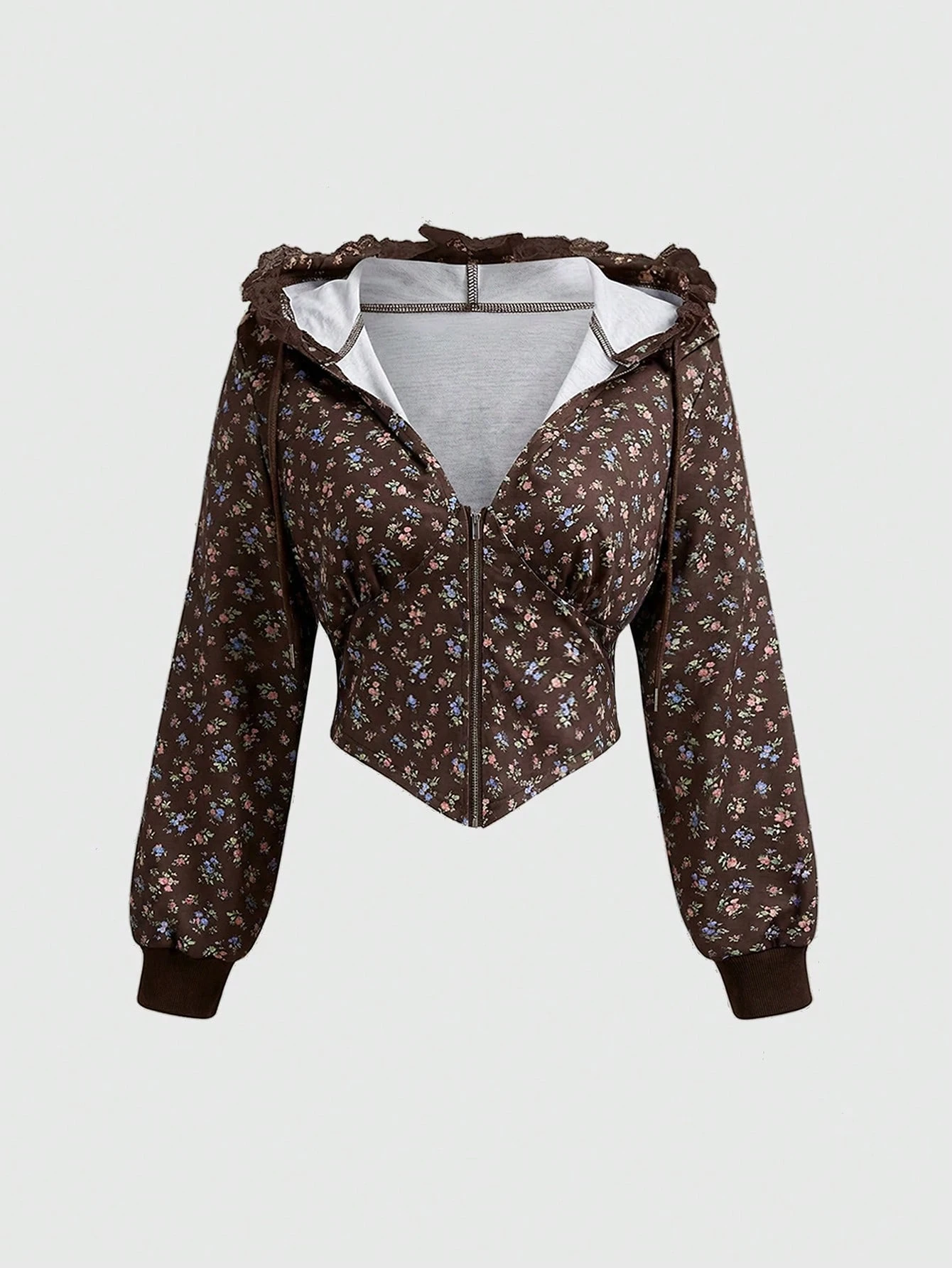 Kawaii بلوزة كبيرة الحجم للنساء بطراز كوتيج كور مزينة بشريط دانتيل وفيونكة، بنمط أزهار بني لطيف كاواييي للسيدات