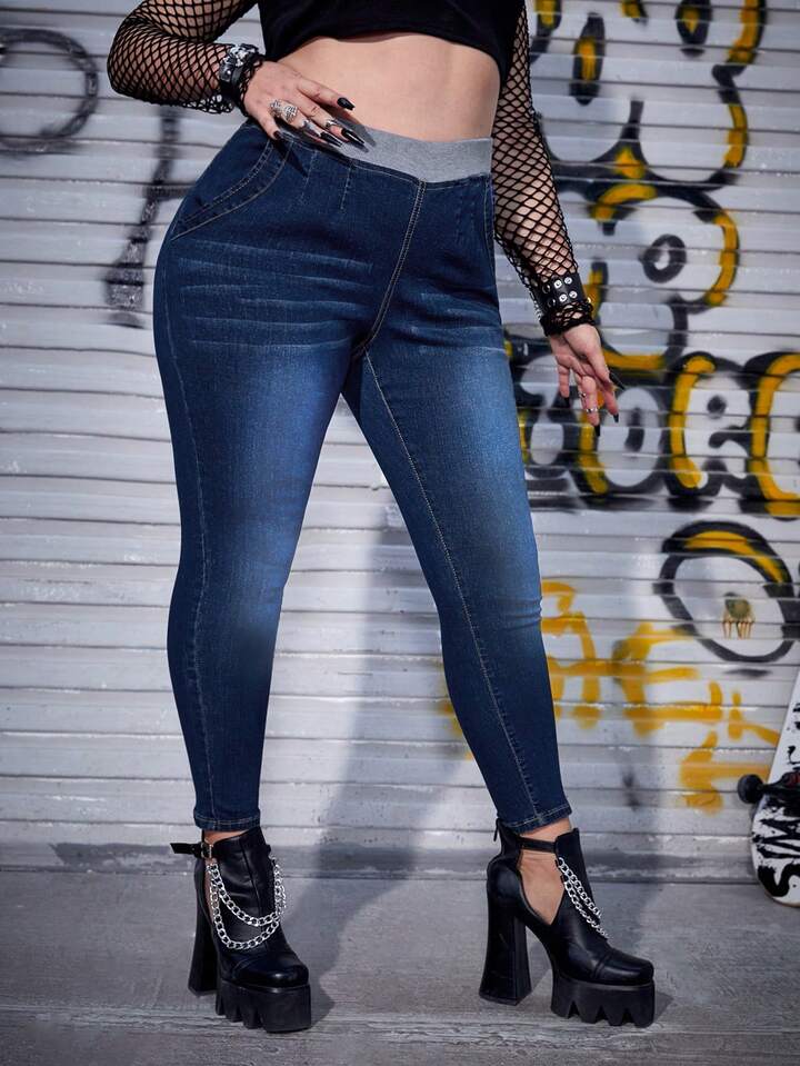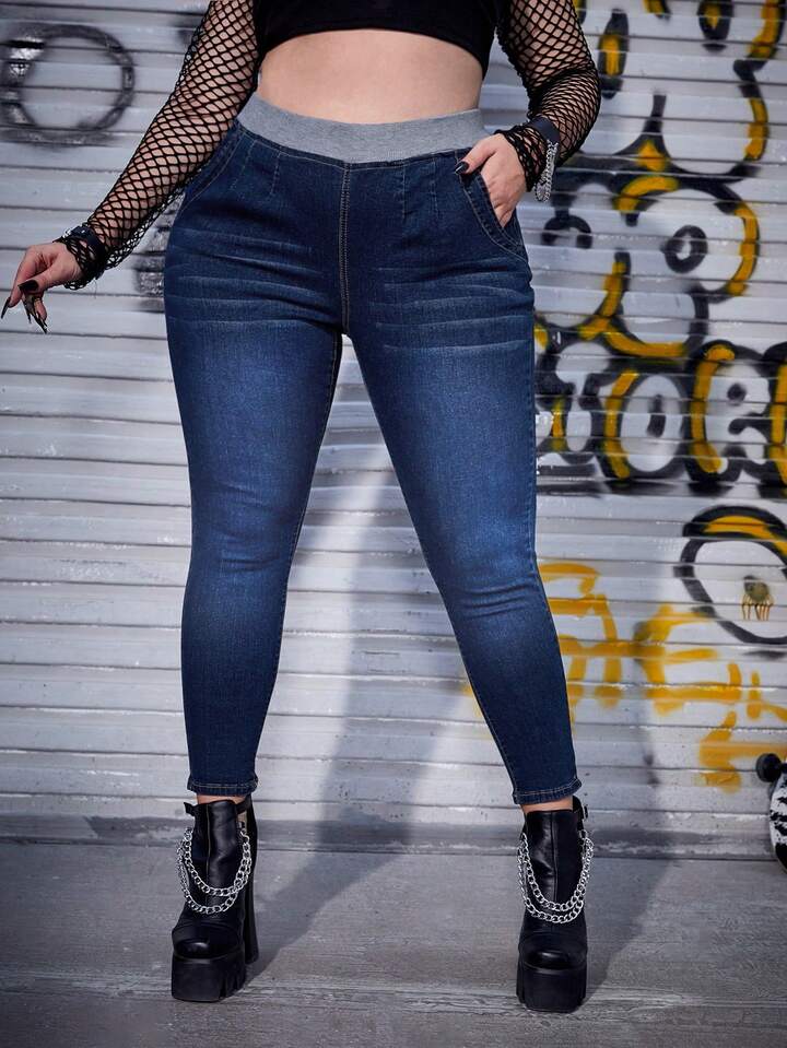 بنطلون جينز جيب مائل خصر مرن مقاس كبير