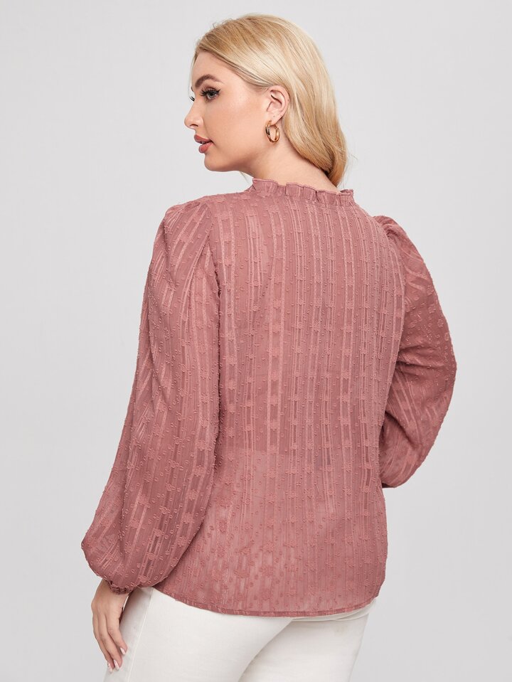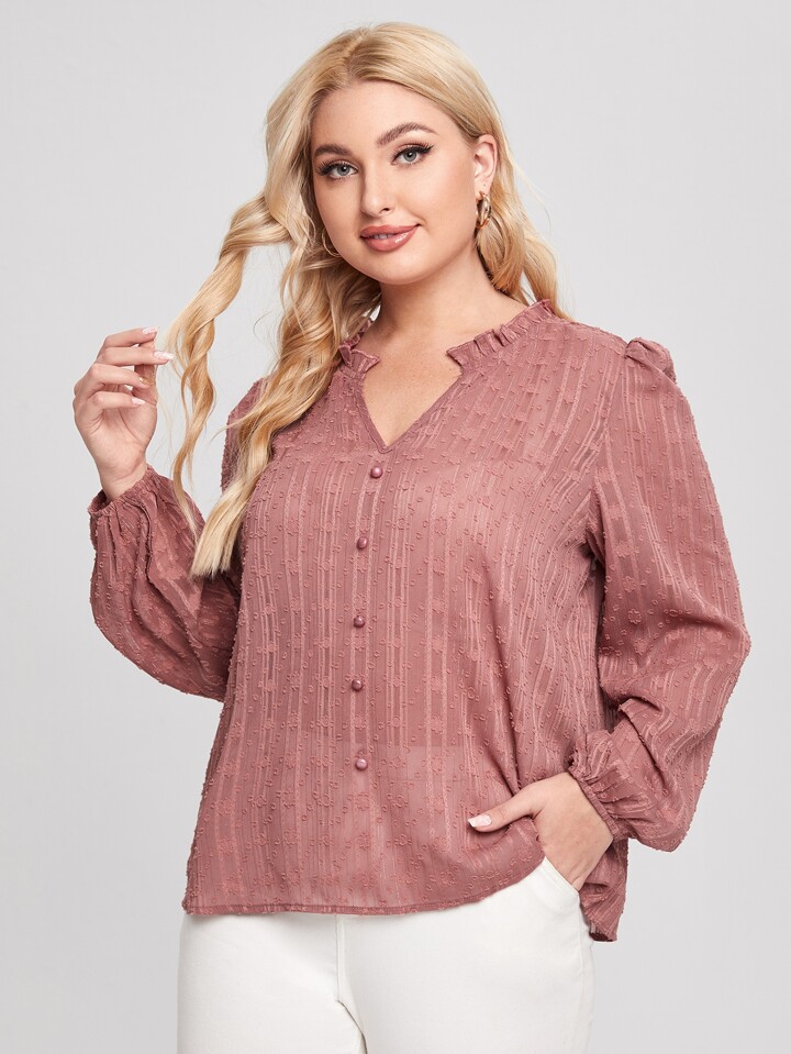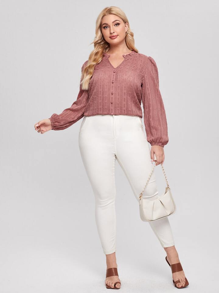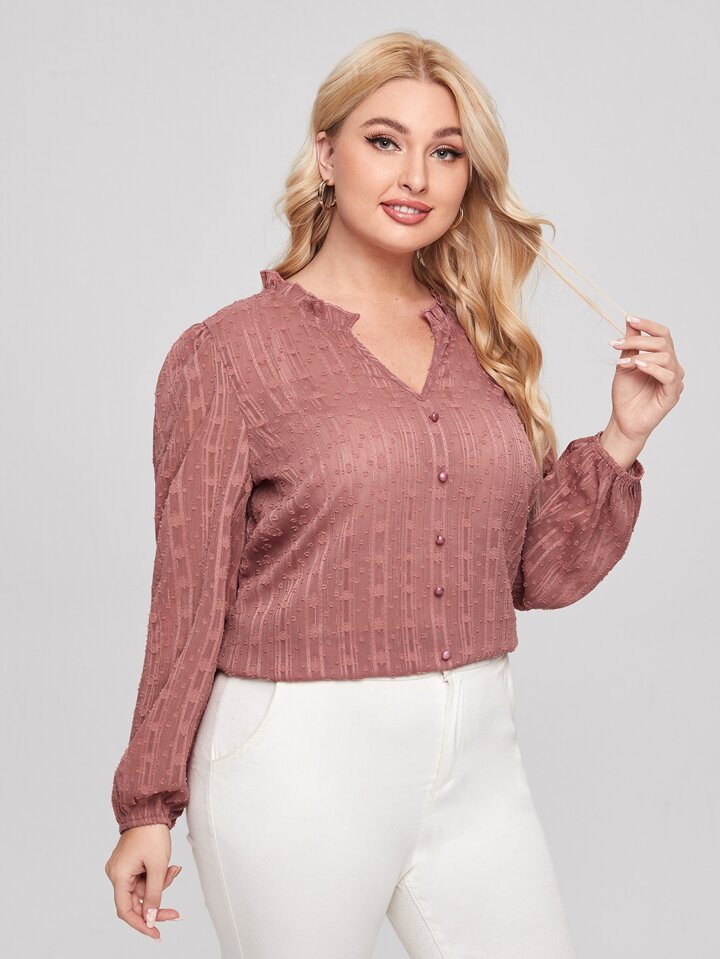 بلوزة بياقة بفتحة مقلم بكشكش بلون موحد مقاس كبير