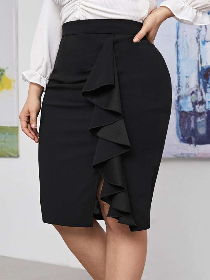 تنورة مقاس كبير بفحتة مقلم مكشكش بلون موحد