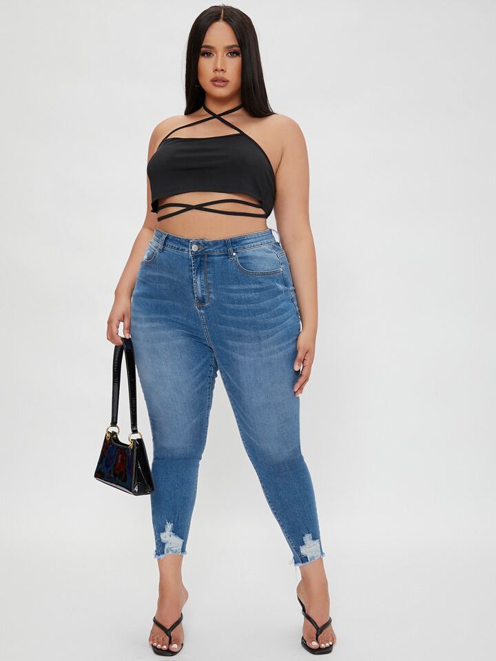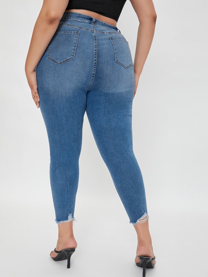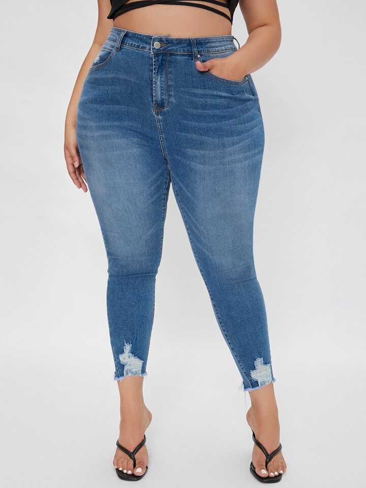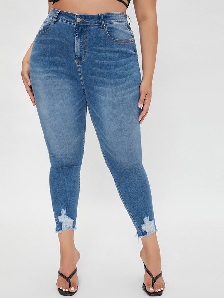 بنطلون جينز نحيل بحافة خام ممزق مغسل حجر مقاس كبير