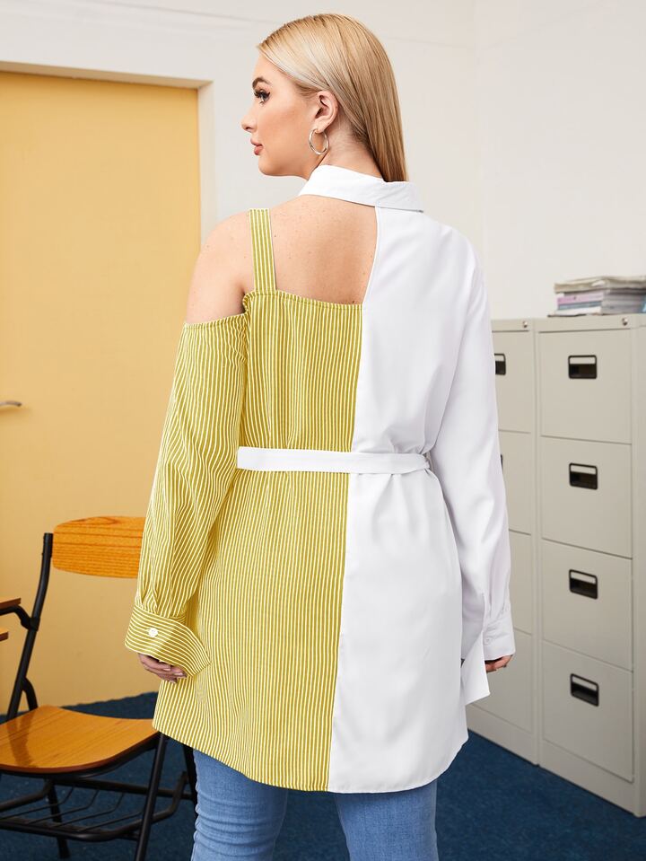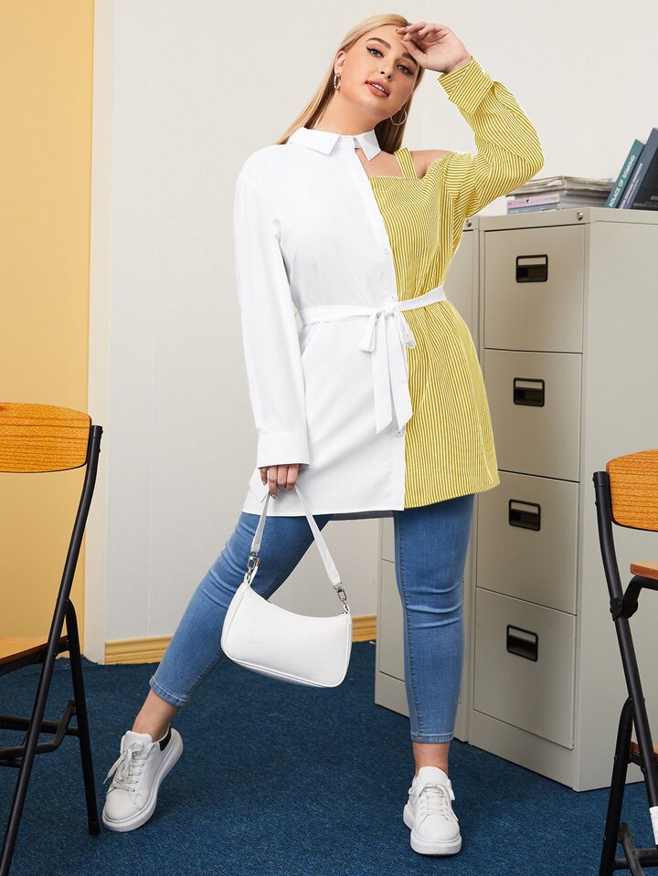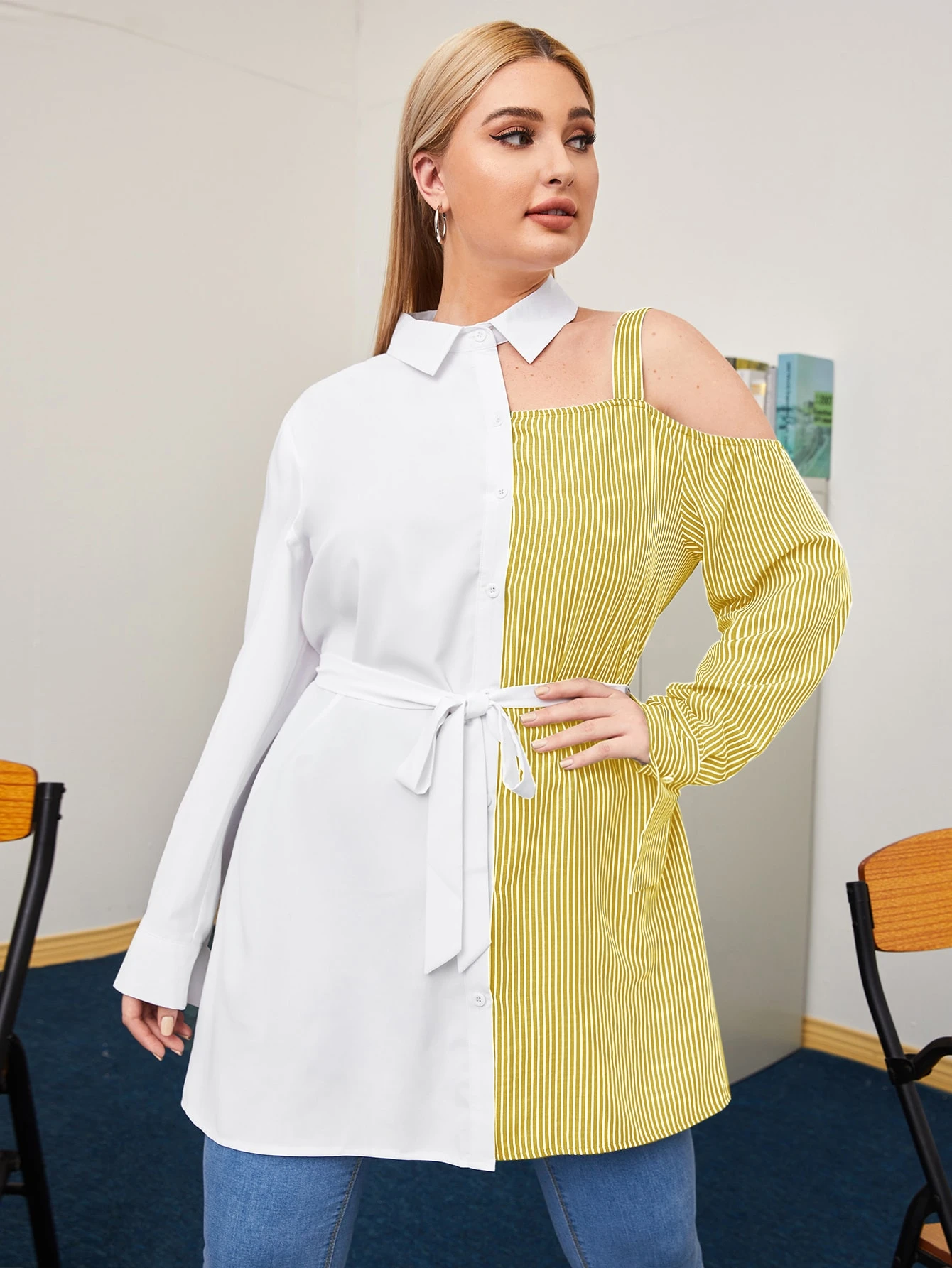 بلوزة بحزام بعنق غير متماثل بألوان متجانس مخطط مقاس كبير