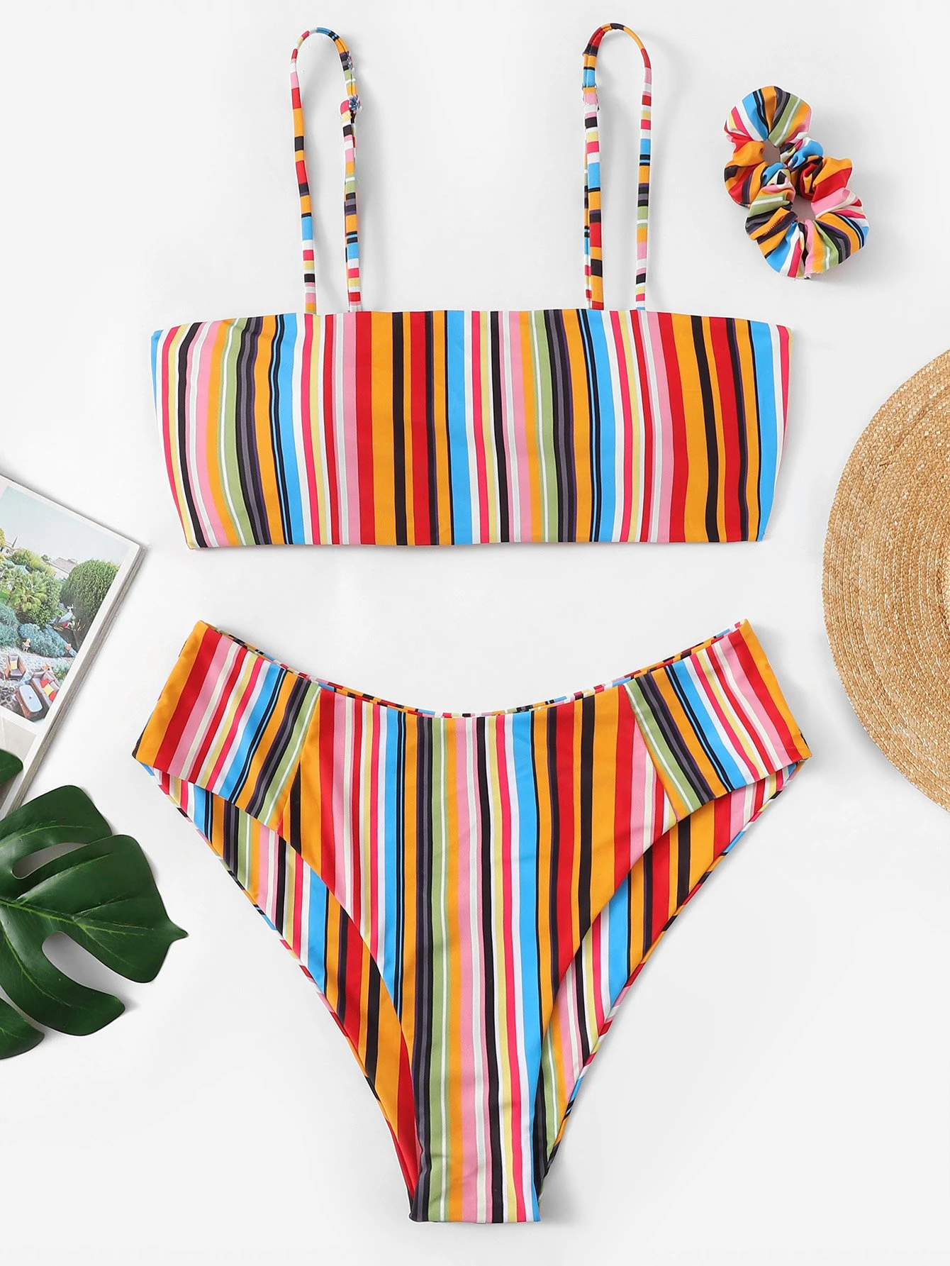 بكيني حجم كبير بقص عالي مخطط ومتعدد الالوان مع ربطة شعر