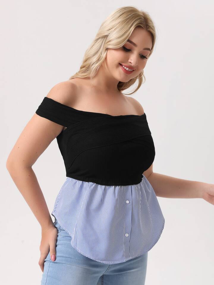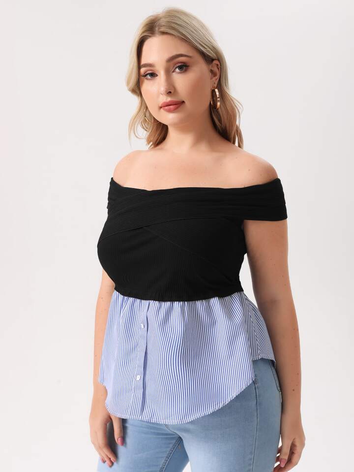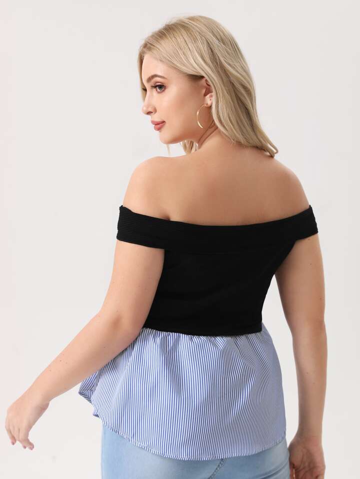 بلوزة محبوك مضلع مكشوف الاكتاف ومخطط مقاس كبير