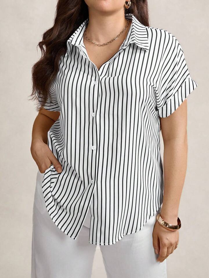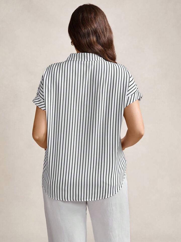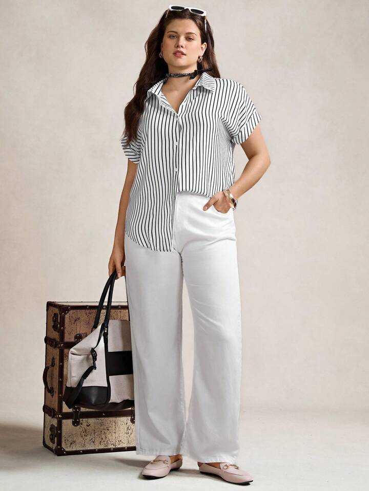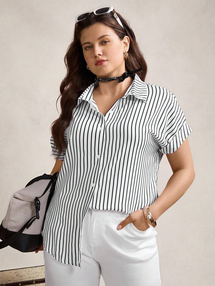 قميص أمامي بأزرار مطبوع بشريط، صيفي