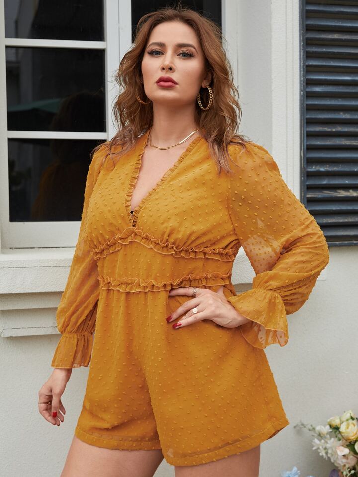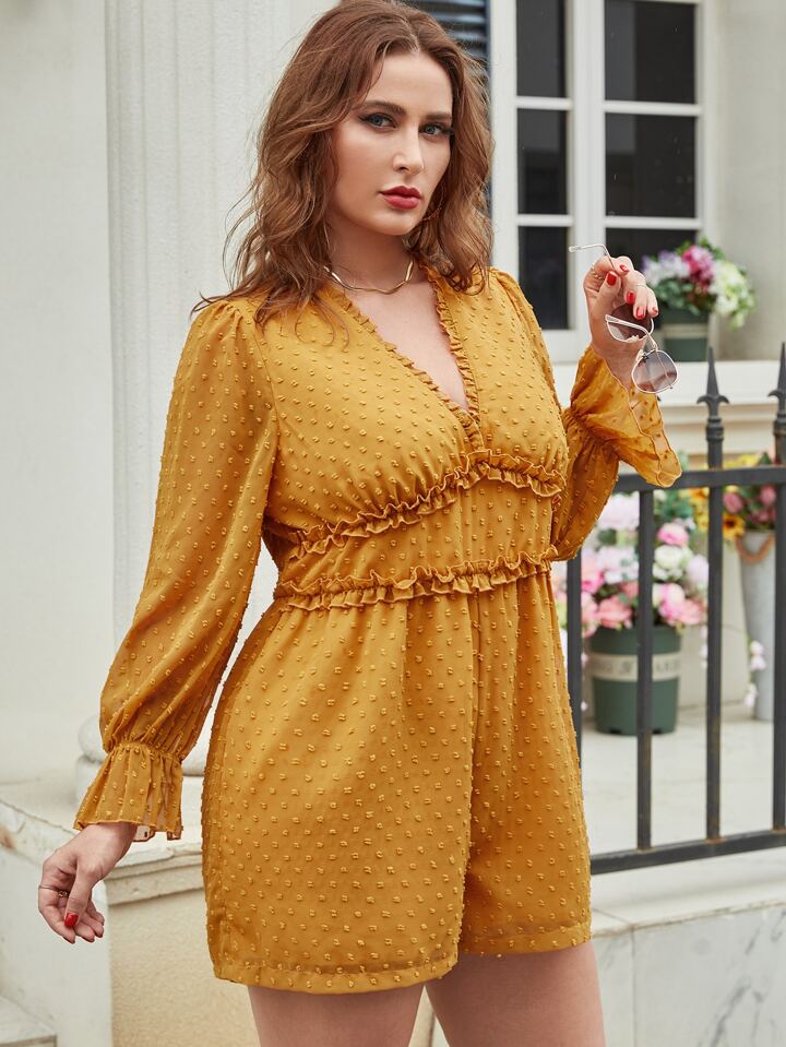 مقاس كبير رومبير منقط سويسري مقلم بهدب اكمام منتفضة
