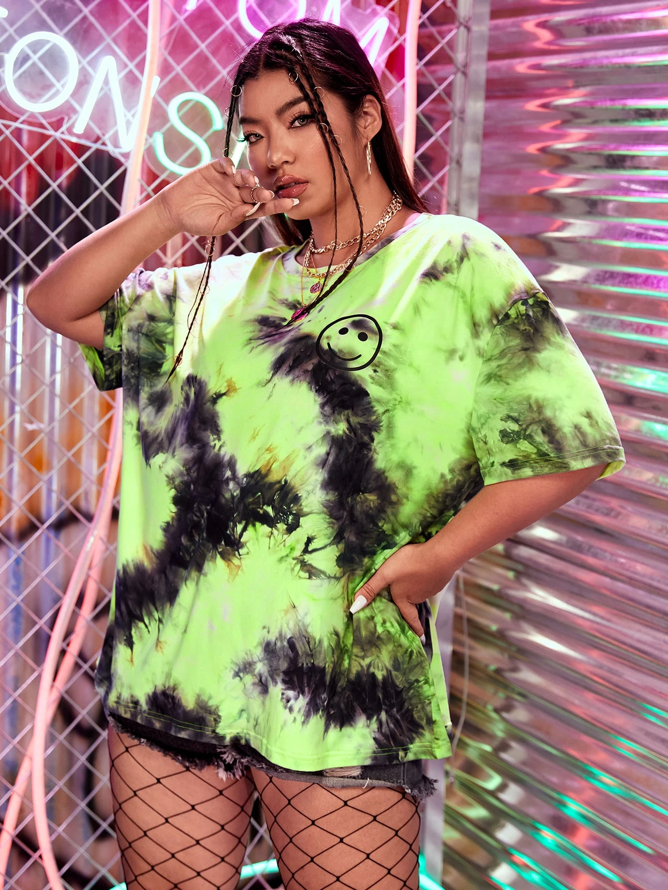 تي شيرت منخفض الاكتاف صبغ متعادل بطباعة تعابير مقاس كبير