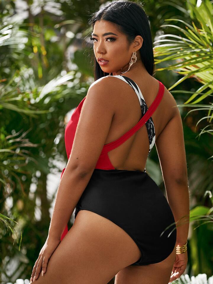 ملابس سباحة قطعة واحدة بخصر معقود وبطباعة استوائي مقاس كبير
