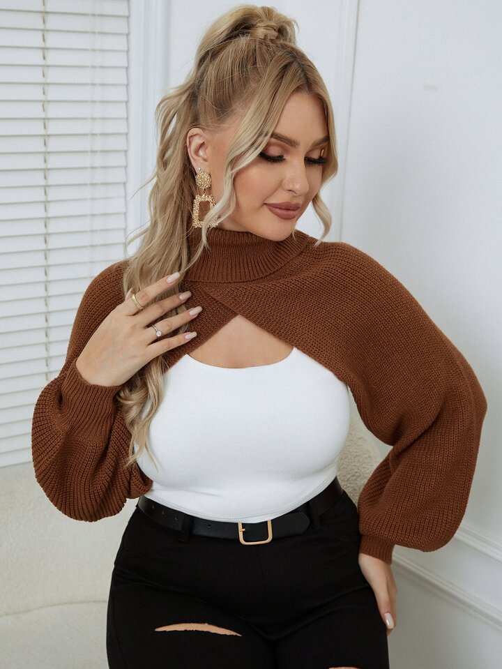كنزة صوف بعنق عالي مدور بوليرو بدون لباس علوي كامي مقاس كبير