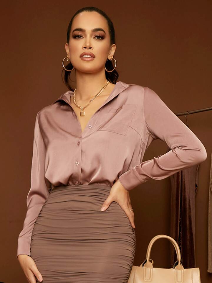 قميص بجيب أمامي أحادي اللون، ملابس علوية ذوي الأكمام الطويلة