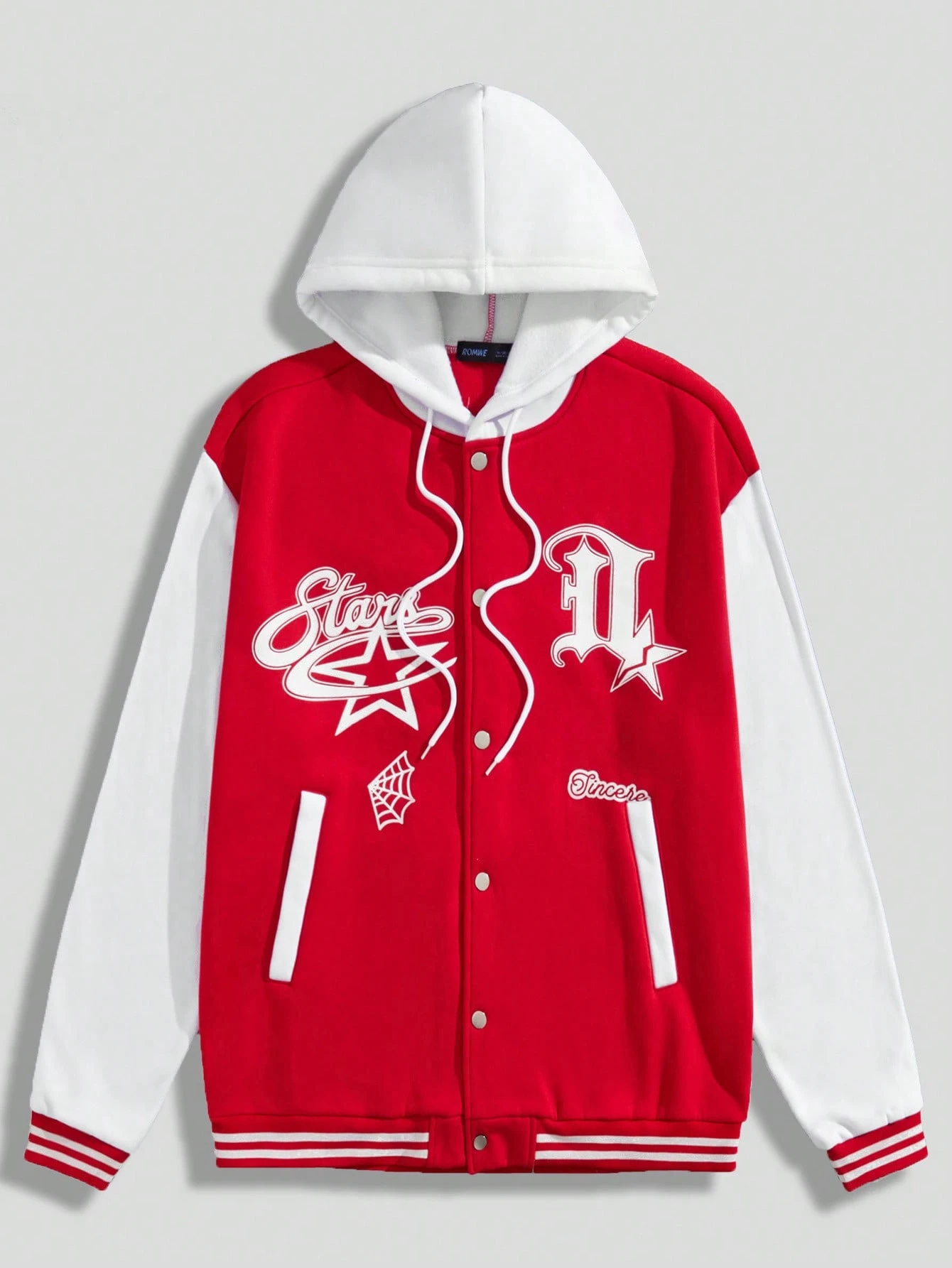 Prep سترة بيسبول رجالية بأزرار واحدة مطبوع عليها نجمات وحروف تحجب الألوان