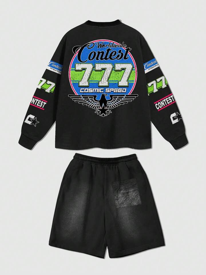 Prep طقم تي شيرت كم طويل بطباعة حرفية وشورت للرجال
